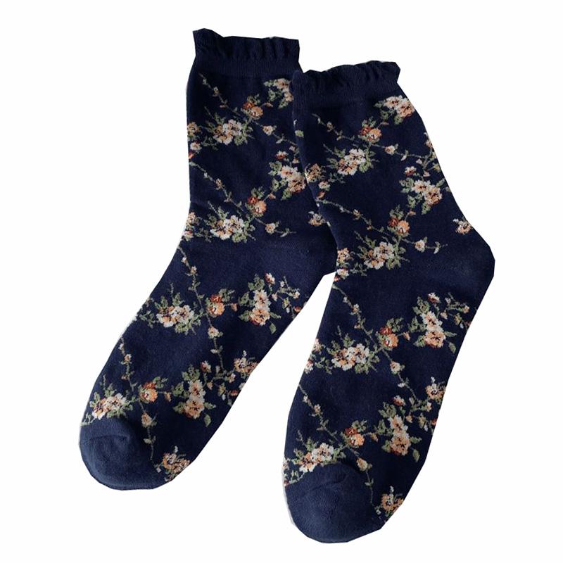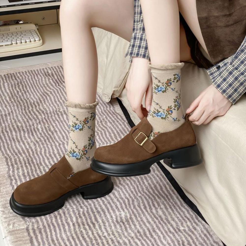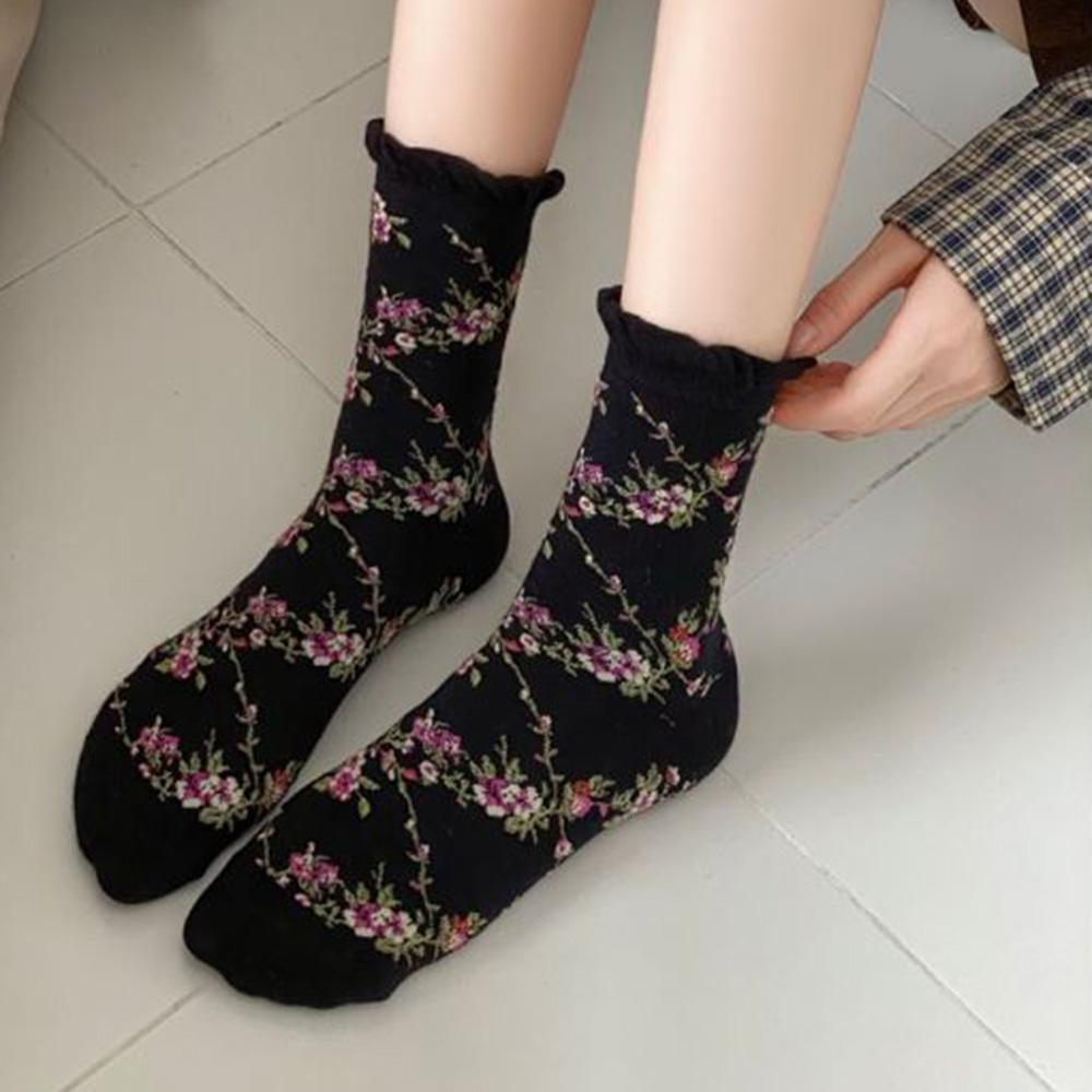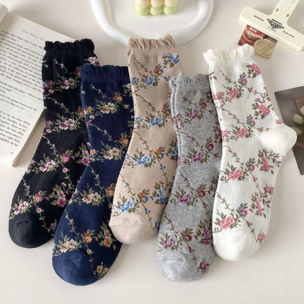 5 пар осенне-зимних носков средней длины для женщин, модные носки с оборкой и цветочным принтом, милые носки в стиле Лолиты, повседневные носки для женщин