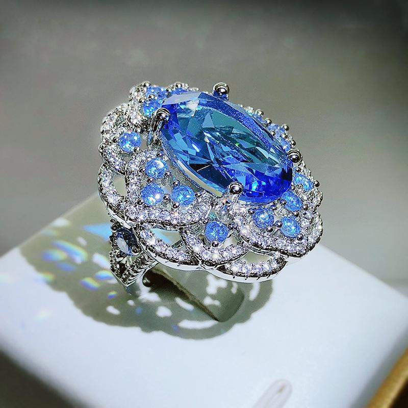 Высококачественное сверкающее кольцо с крупным цветком из синего циркона для женщин, серебряное, модное, для свадьбы, вечеринки, предложения, ювелирное изделие, подарок