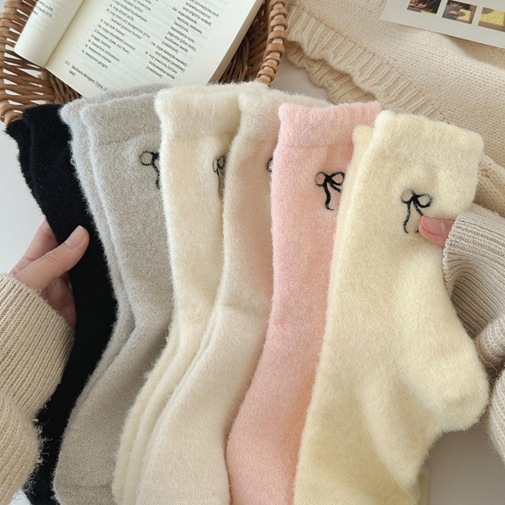 Кавайные носки из толстого кораллового велюра в балетном стиле с бантиком, милые плюшевые носки для дома, зимние, теплые, однотонные, средней длины