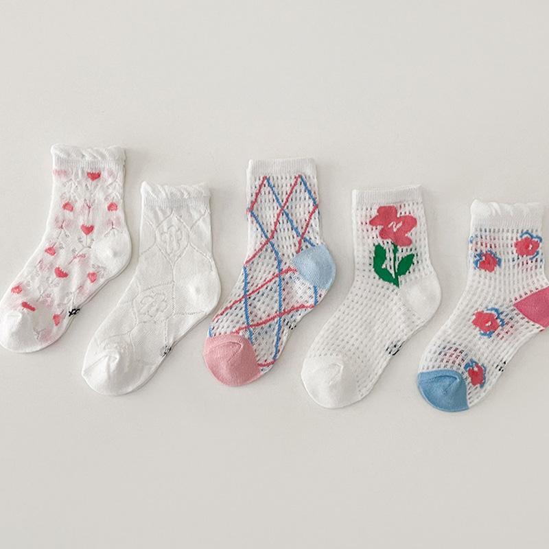 5 пар летних сетчатых носков для девочки, носки с цветами, полые дышащие носки средней длины, цветочные принцессные детские хлопковые носки 0-8 лет