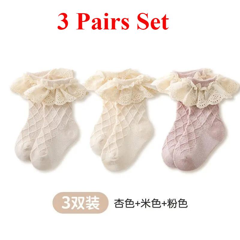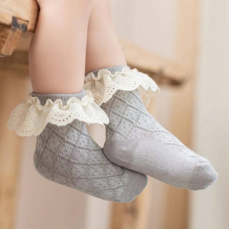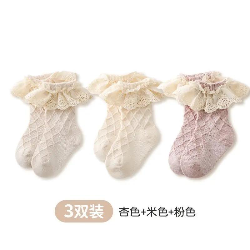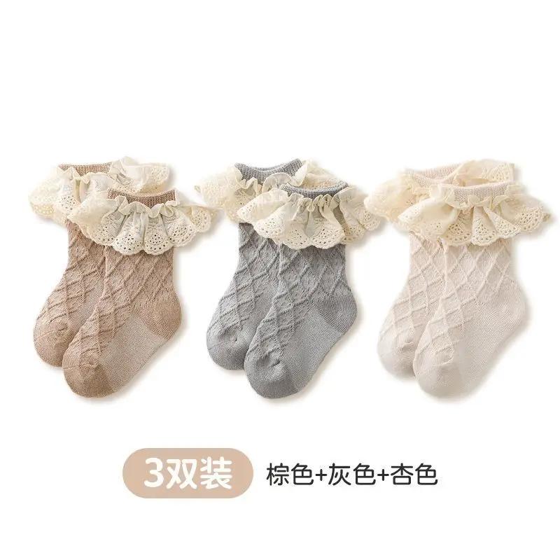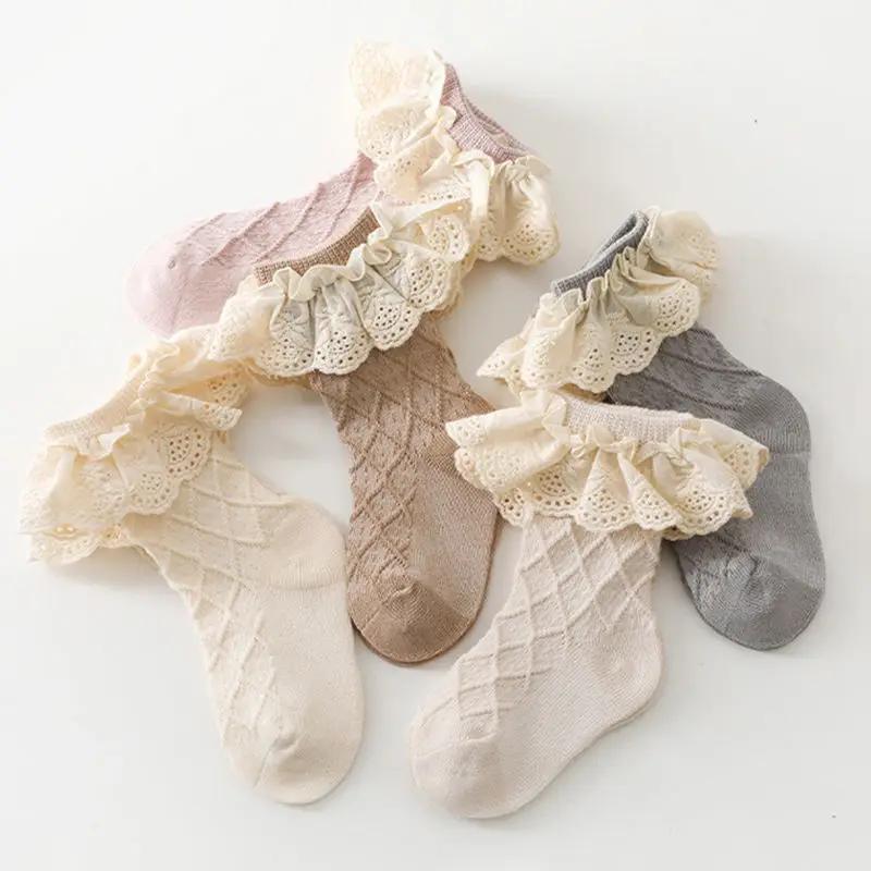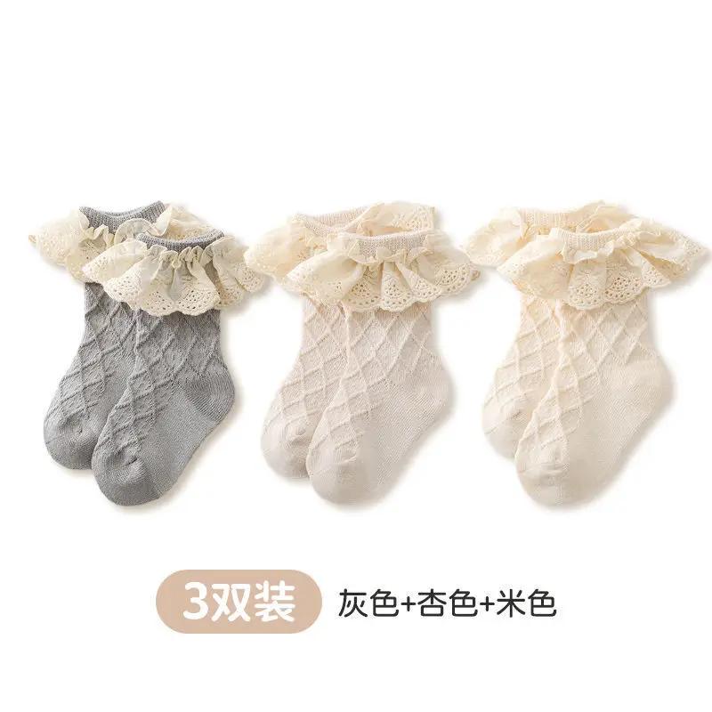 3 пары детских носков весна-осень из чистого хлопка, средней длины, с бантом, носки принцессы, для новорожденных детей, для маленьких девочек, кружевные носки