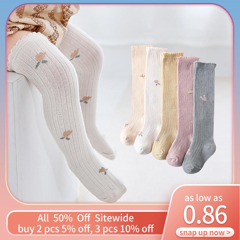 Весенне-летние тонкие детские длинные носки из мягкого хлопка, дышащие чулки с цветочным принтом, нескользящие напольные носки, защита колен, Sokken