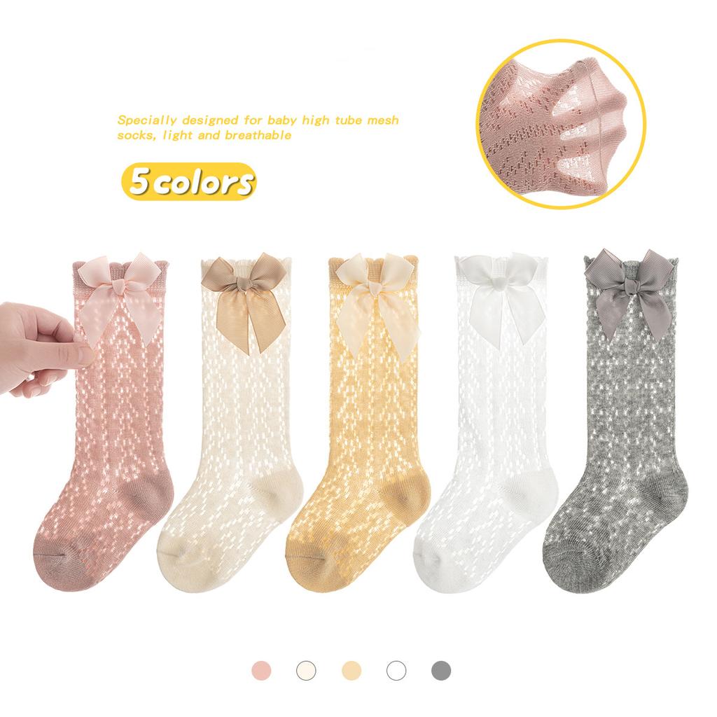 Детские носки для девочки, носки-гольфы из хлопка и сетки с бантом для малышки, однотонные дышащие носки для новорожденной девочки, гольфы 0-3 года
