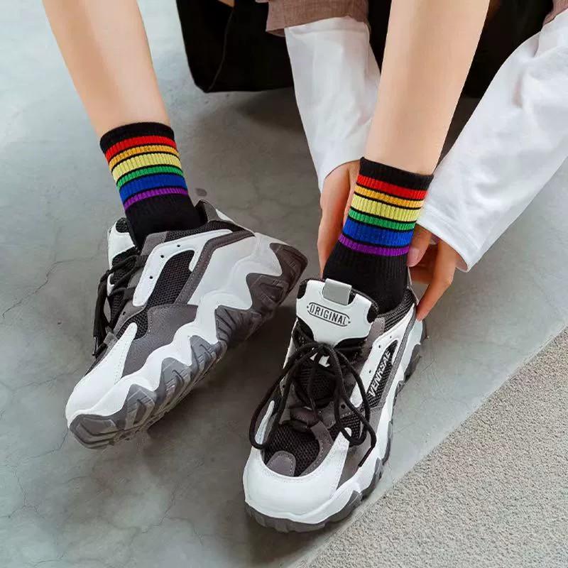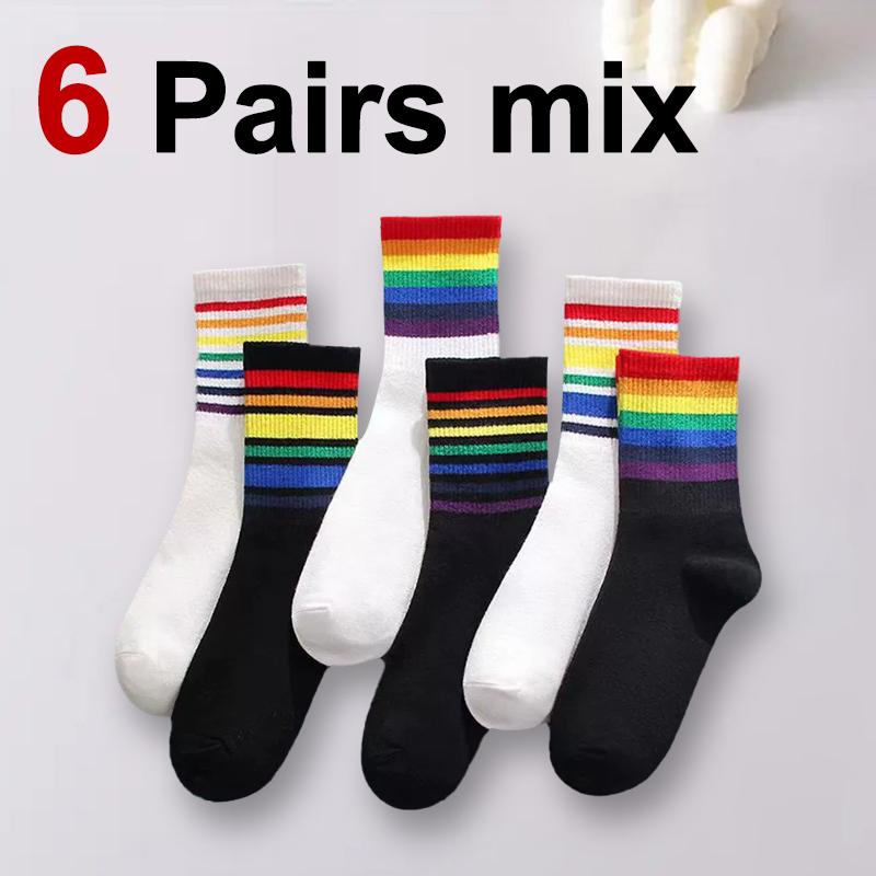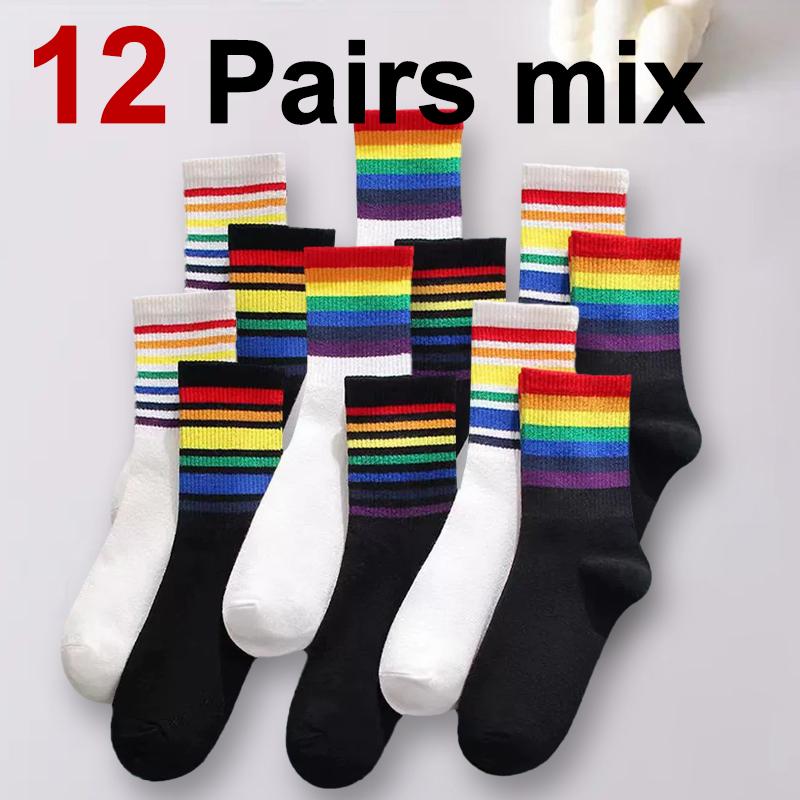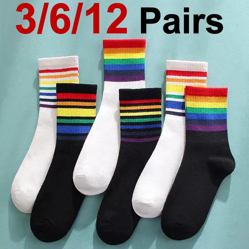 3/6/12 пар женских хлопковых носков средней длины с радужным узором, модные полосатые, влагопоглощающие, дышащие, мягкие, удобные, повседневные носки