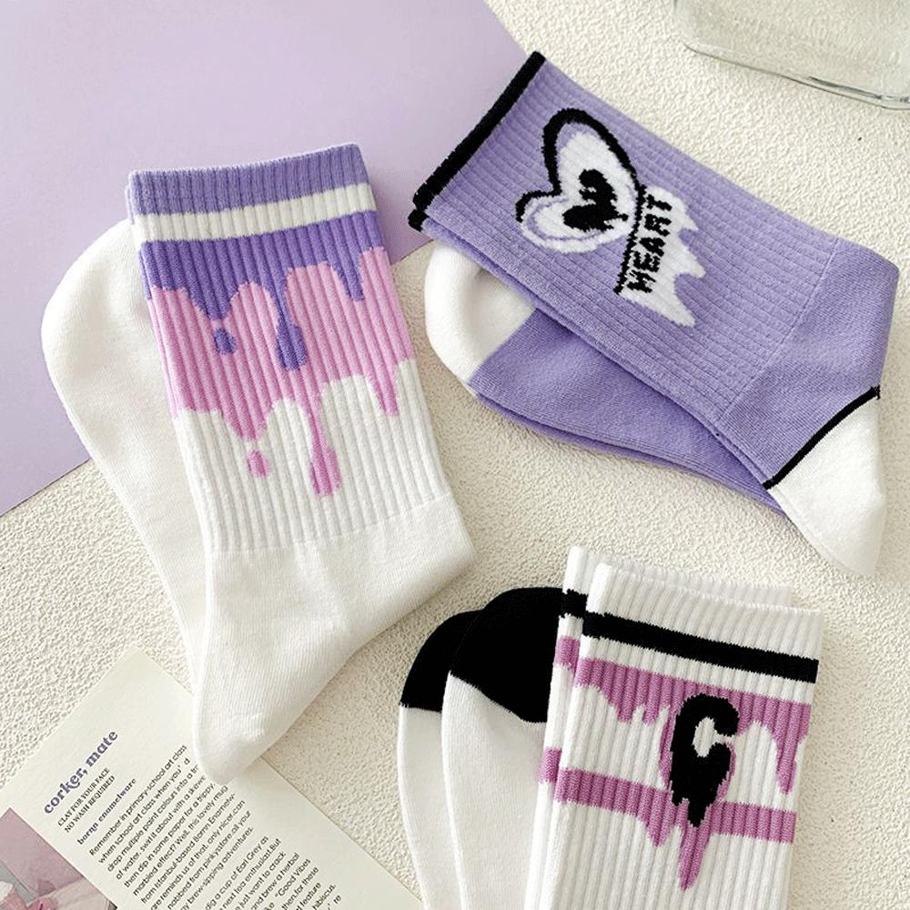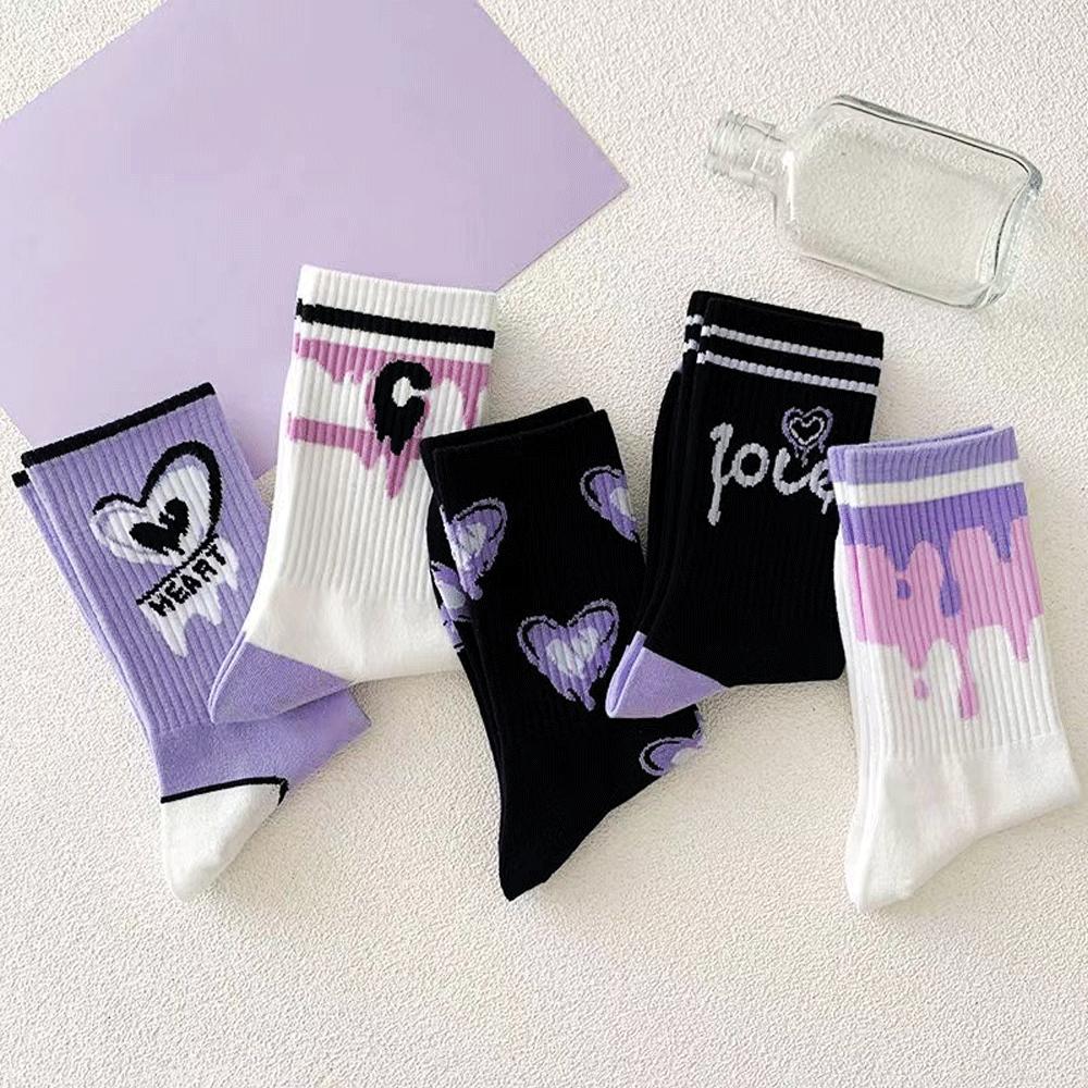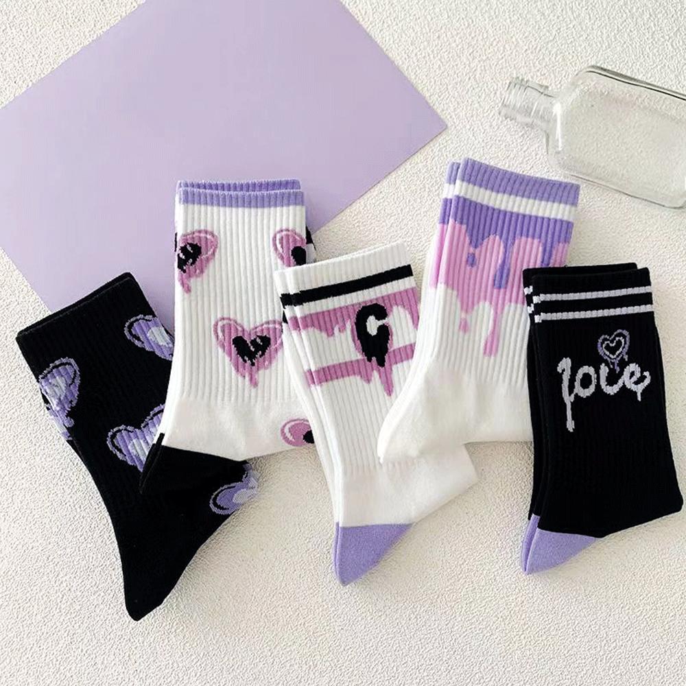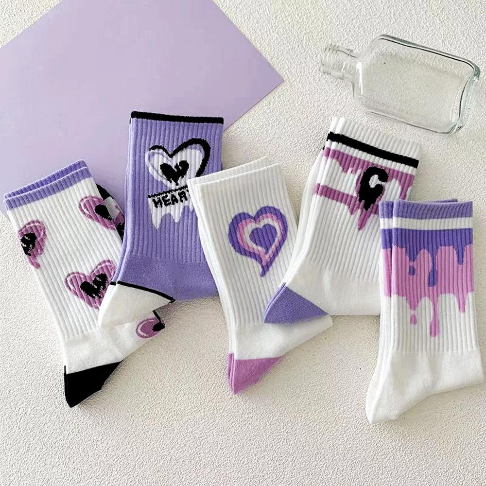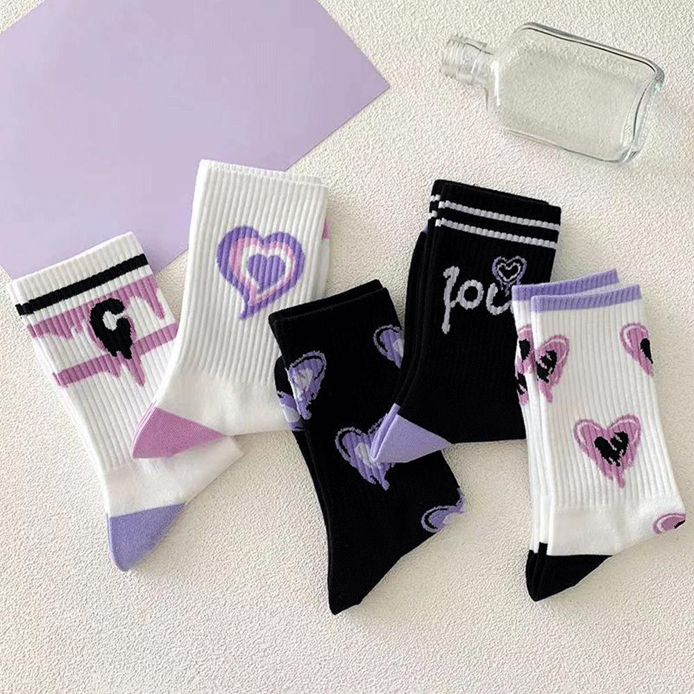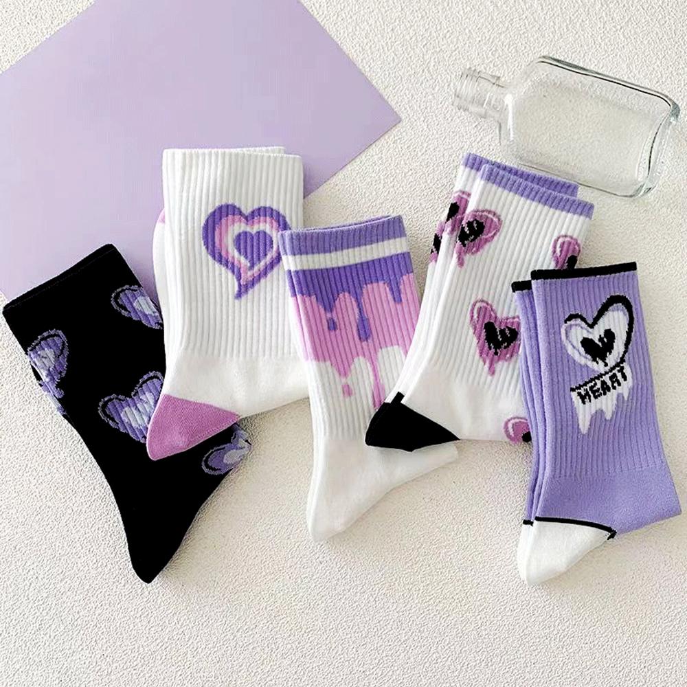 Женские белые носки, милые хлопковые носки с сердечками, Kawaii, консервативный корейский стиль, аниме, фиолетовые женские носки, комплект из 5 пар
