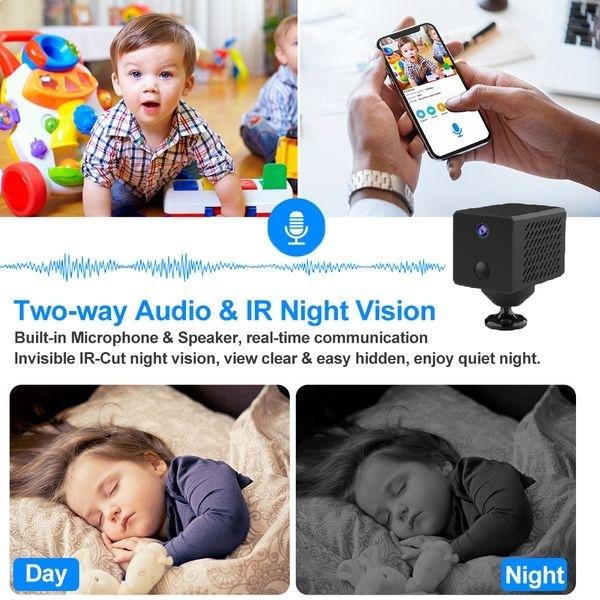 Эта мини-камера с большой батареей обеспечивает видео в формате Full HD 1080P.. Он оснащен инфракрасным зрением, двусторонней аудиосистемой.. Доступ к видео можно получить удаленно через Wi-Fi или P2P.. Он выигрывает от детектора.* Размеры : 3,5 х 3,5 х 5,5 см