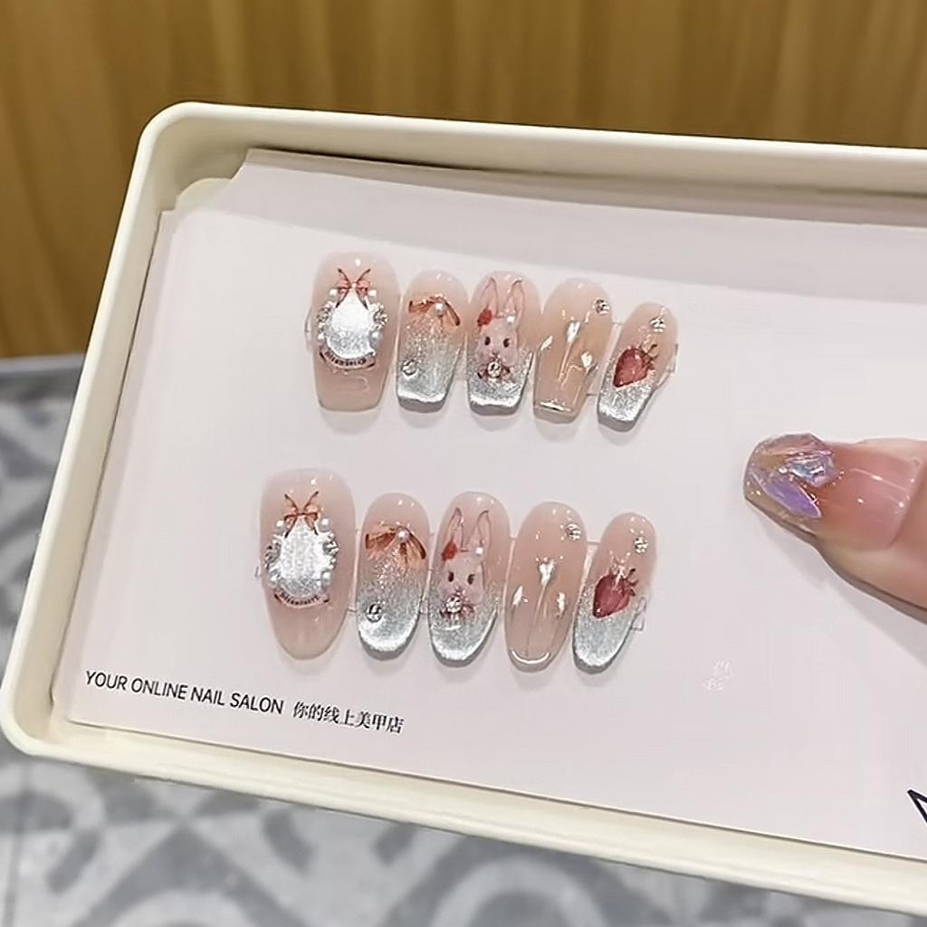 Чистые ручной работы фототерапевтические накладки для ногтей в стиле рококо с милым кроликом, многоразовые, съемные