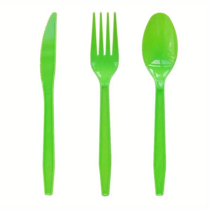 75 наборов многоразовых многоцветных пластиковых столовых приборов: ножей, вилок и ложек, которые очень подходят для званых обедов.