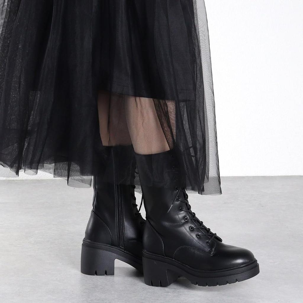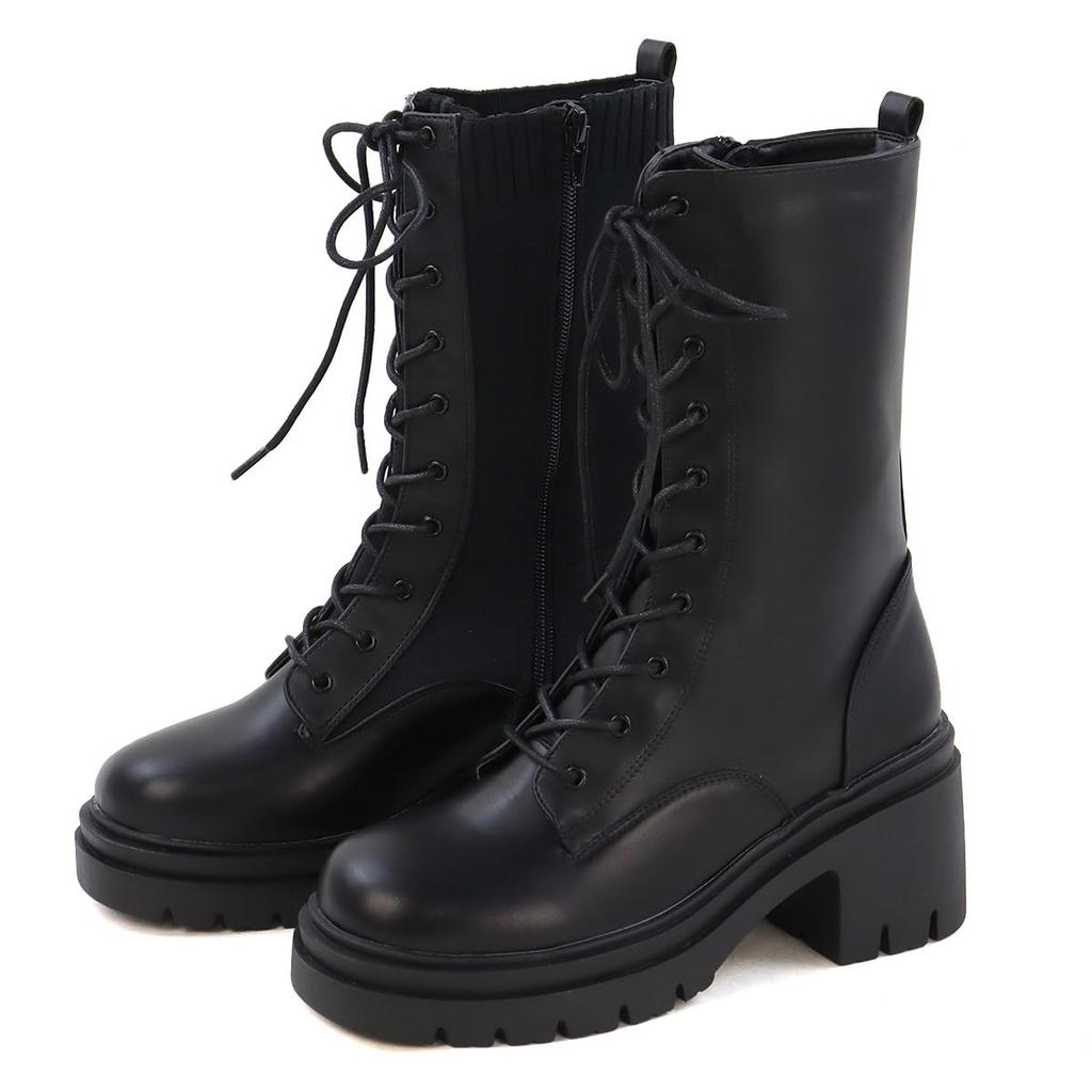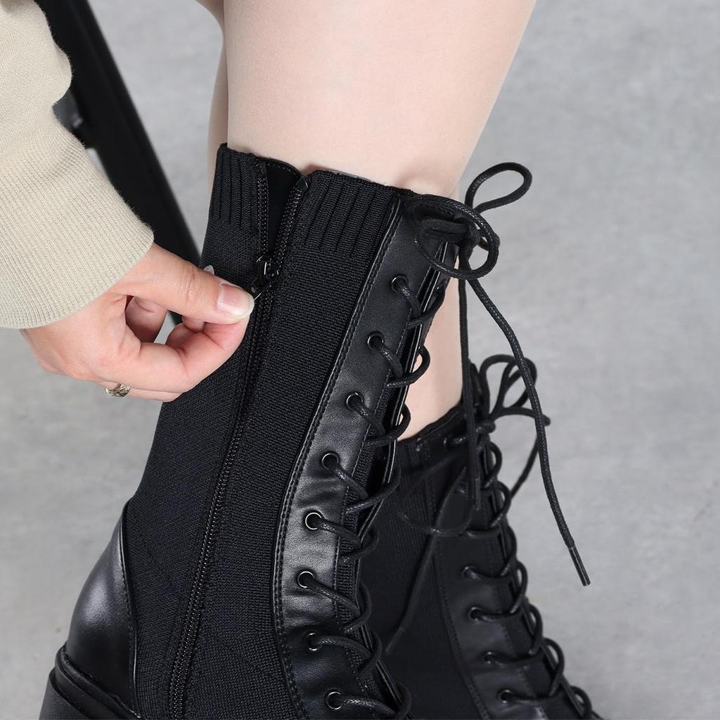 Сапоги с толстым гладким носком [Liberty Doll], ботинки средней длины, ботинки на шнуровке, подошва, каблук 7,5 см, трикотаж, платформа,