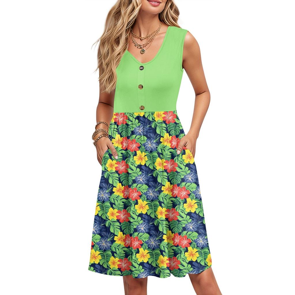 Женские летние платья с принтом, без рукавов, повседневные, свободные, расклешенные, на пуговицах, миди-сарафан с карманами