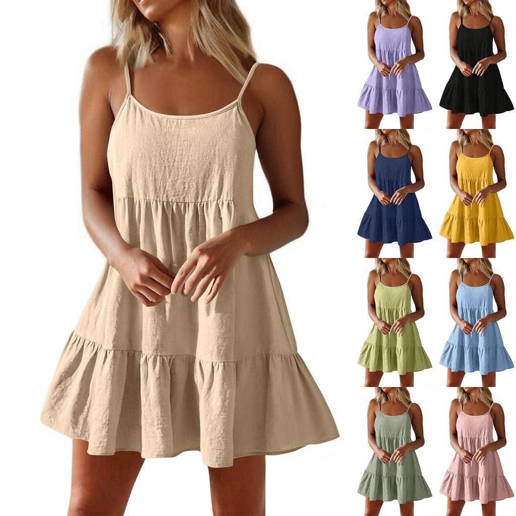 Летнее сексуальное вечернее однотонное платье на тонких бретельках с оборками, короткое, повседневное для женщин