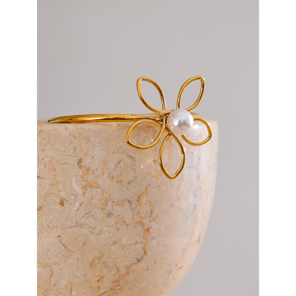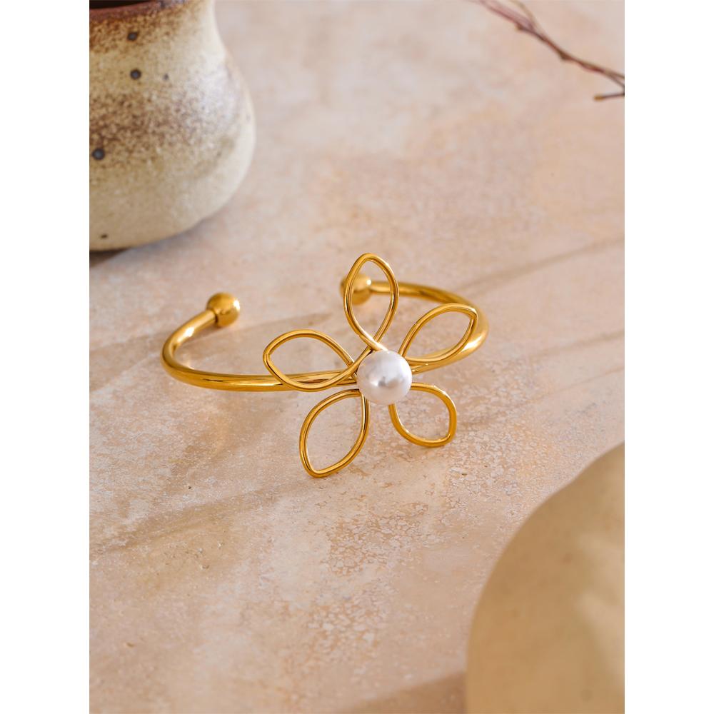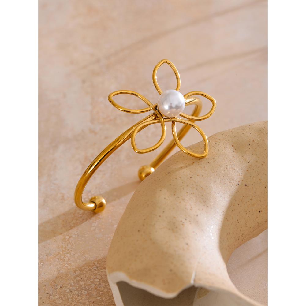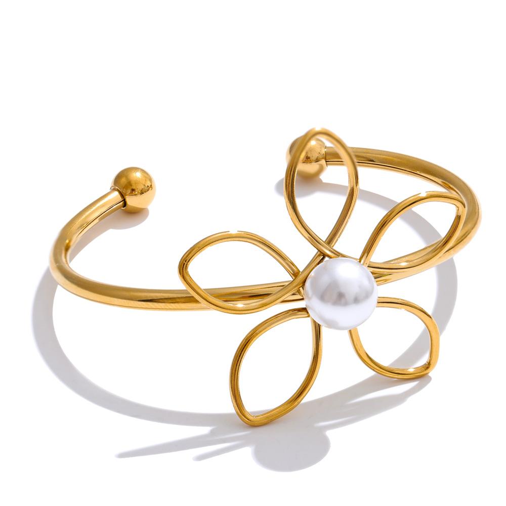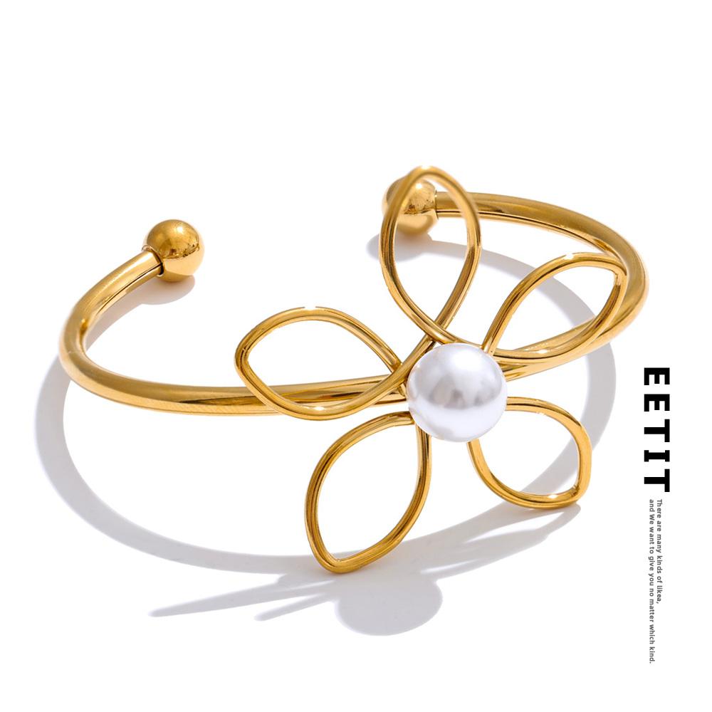 Eetit Браслет-манжета из нержавеющей стали 316L 50 мм с полым узором в виде цветка жемчуга, водостойкий, в трендовом стиле, украшение на запястье, рекомендуем