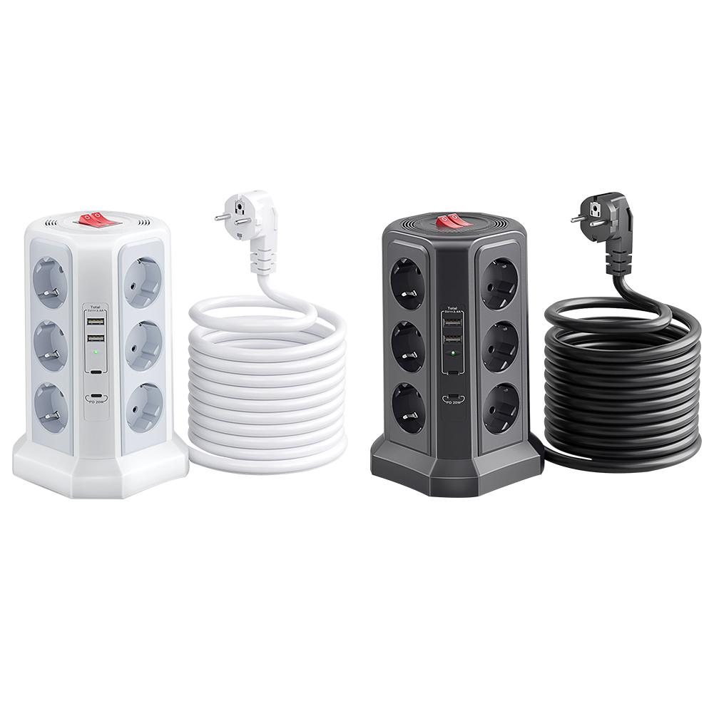 Сетевой фильтр 12 бит с защитой от перенапряжения 4000 Вт 16 А с удлинительным кабелем 1,8 м, 2 порта USB A и 2 порта USB C PD20 Вт, верхний переключатель
