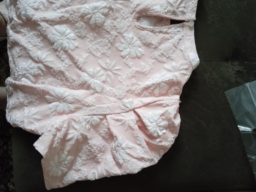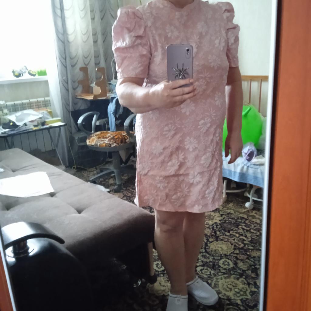 Платье синтетика, плотная, немного тянется. На рост 168 выше колена на 10 см. Размер подошёл, даже немного свободно в талии и бёдрах, в груди нормально. Застёжка пуговица на шее со стороны спины. Единственное что мне не понравилось это рукова в районе плеча, они почему то увеличивают плечи в стороны, возможно если постирать и отгладить то они лягут и перестанут топорщиться
