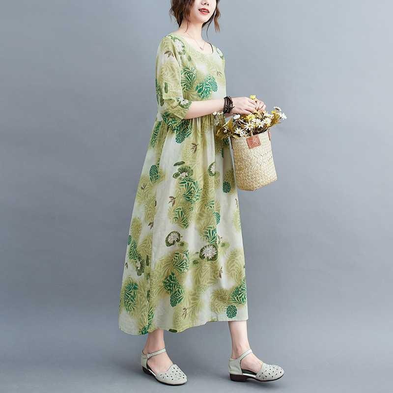 Летние новые большие размеры свободные тонкие круглые вырезы рукава пять минут женские платья для уменьшения возраста