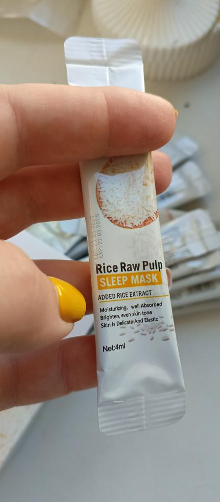 Увлажняющая рисовая ночная маска ✔️Интенсивное увлажнение и восстановление кожи ✔️ Маска глубоко насыщает кожу влагой, помогает справиться с сухостью и шелушением, улучшает эластичность и упругость кожного покрова. ✔️Благодаря экстракту риса маска стимулирует регенерацию кожи, делает её гладкой, укрепляет кожный тургор, разглаживает морщинки и помогает предотвратить преждевременное старения. ✔️ Действует на выравнивание тона кожи, уменьшает пигментацию, тёмные пятна и придаёт лицу сияние. ✔️Маска способствует более ровной, мягкой и сияющей коже за счёт улучшения текстуры и микрорельефа. ✔️Содержит фильтрат ферментации риса и возможно экстракт солодки что дополнительно успокаивает, защищает и восстанавливает естественный барьер кожи. ✔️Наносится вечером как завершающий этап ухода после очищения, тоника и сыворотки. ✔️Мягкими массирующими движениями распределите маску по лицу и шее утром смывается тёплой водой. ✔️Для хорошего эффекта использовать 2–3 раза в неделю. ✔️ Упаковка 20 штук. ✔️ Срок годности 3 года. ✈️Посылка шла около двух недель до Молдовы, Кишинёв. 📌Посылка была упаковано хорошо. 📌Товар без брака. 📌Качество хорошее. 😍Рекомендую и ещё раз рекомендую к покупке!!!