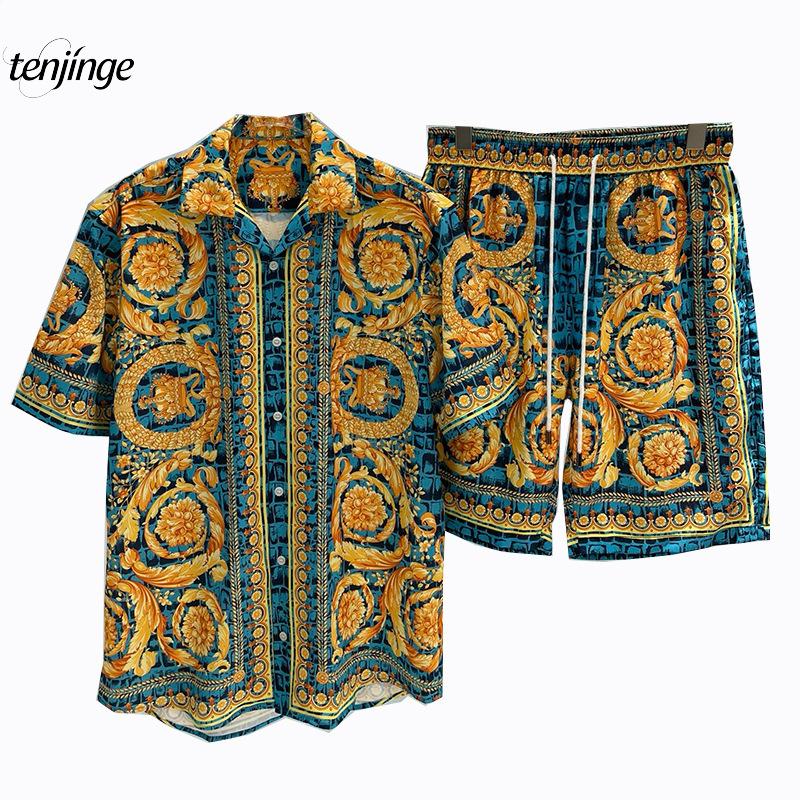 Новый королевский роскошный мужской комплект рубашки Винтажный принт 2 предмета Короткие летние наряды Рубашки с коротким рукавом с принтом Мужская одежда