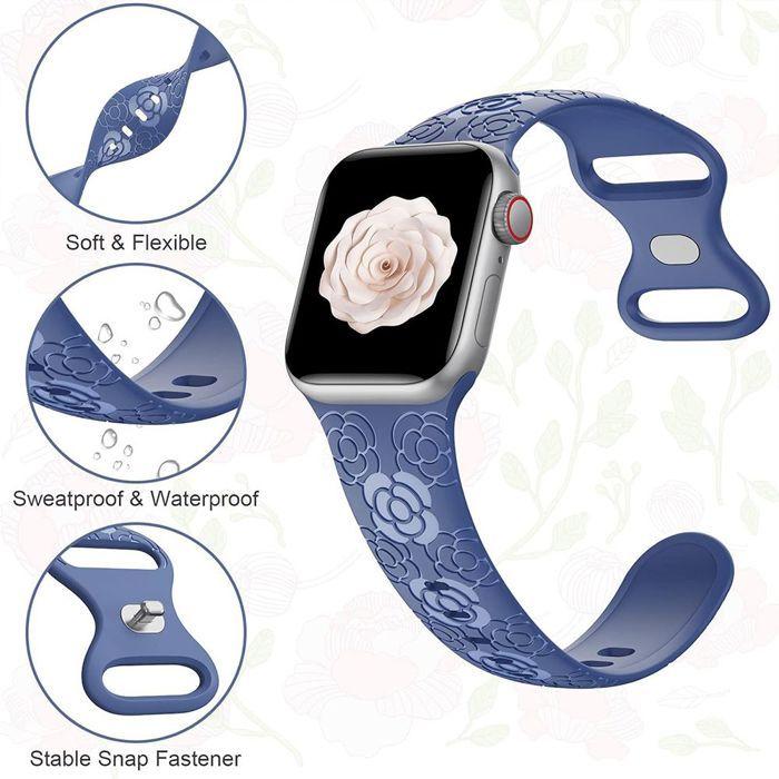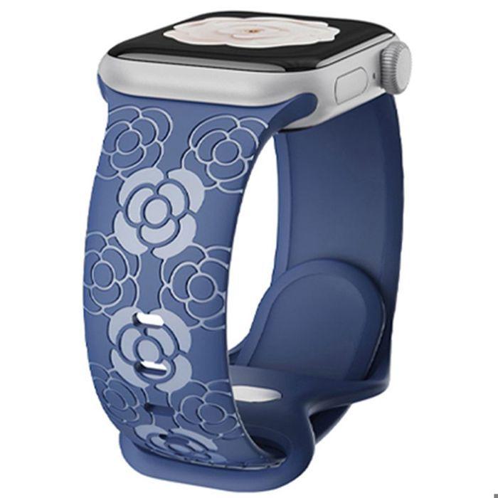 Bracelet pour Apple Watch Series Ultra 2/3, 11, 10, 9 8 SE 7 6 5 4 3 2 1 42mm-44mm-45mm-46mm-49mm Silicone Relief Floral Bleu Foncé