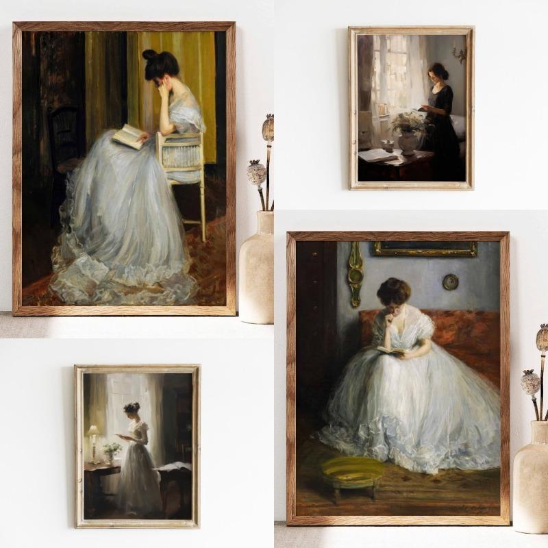 Винтажный европейский портрет читающей леди, художественный принт, ретро-эстетика, женщина в красивом светлом платье, холст, живопись, домашний декор