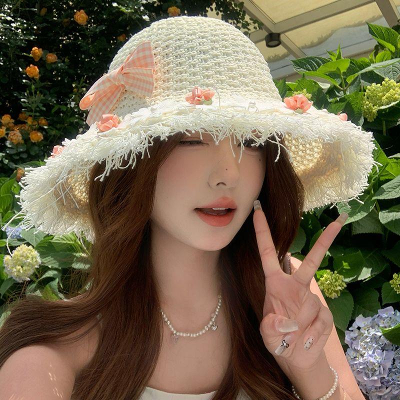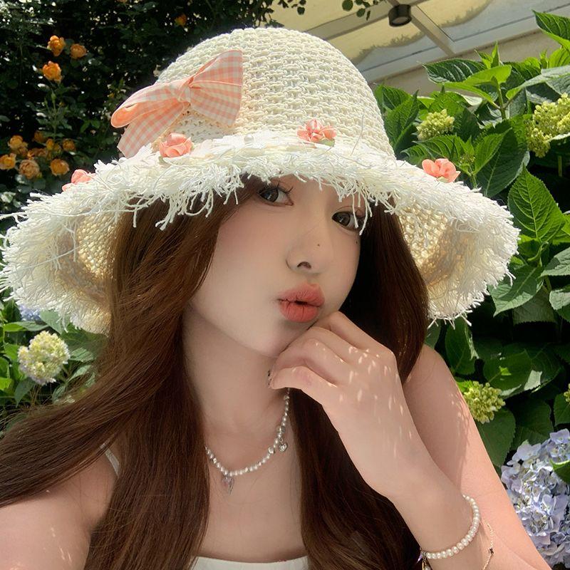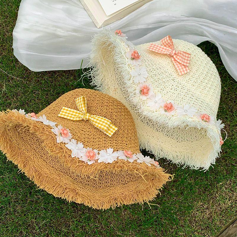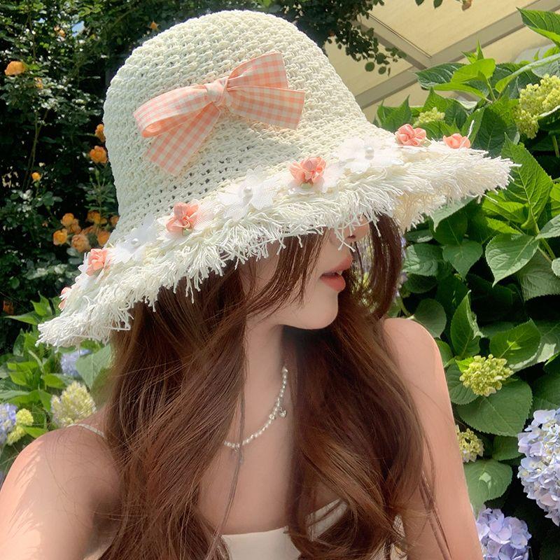 Полосатая шляпа из плетеной соломы с бантом и цветком, с отверстиями, для женщин, летняя, для улицы, солнцезащитная шляпа, шляпа рыбака