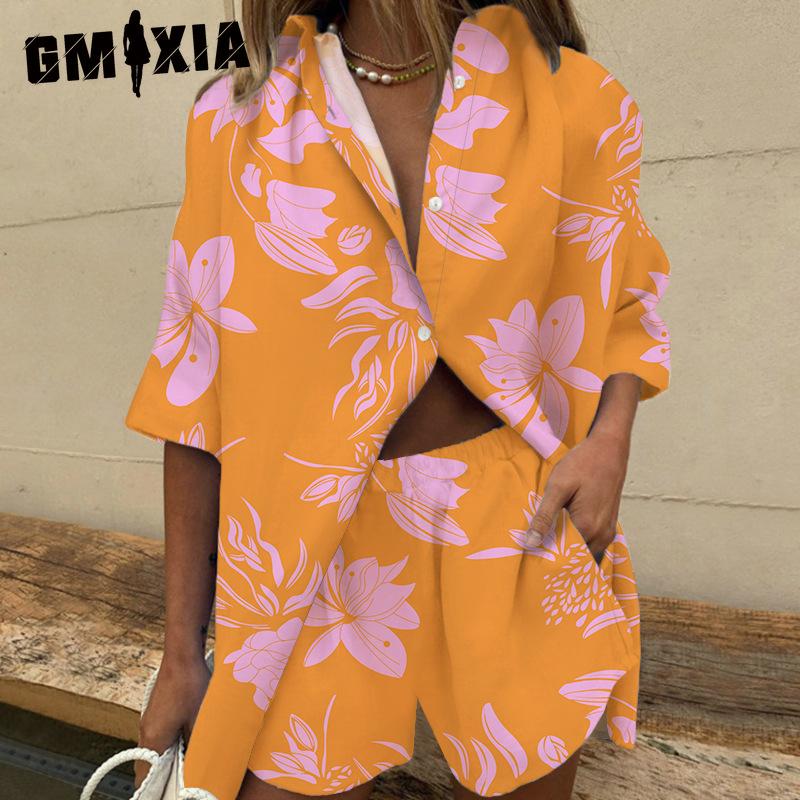 GMXIA Женский комплект рубашки с коротким рукавом и двойным воротником с принтом, брюки и шорты с широкими штанинами и эластичной талией