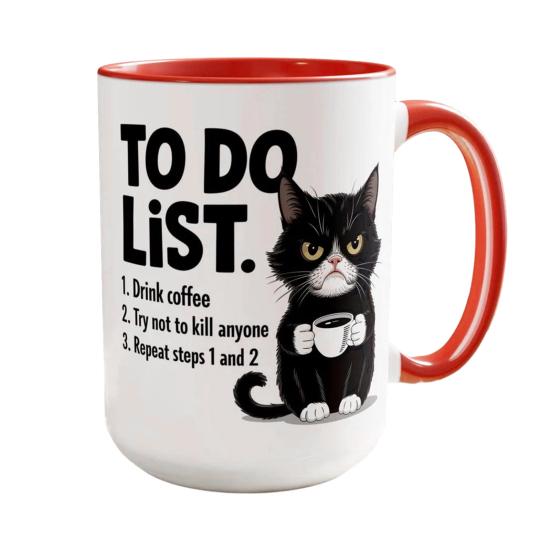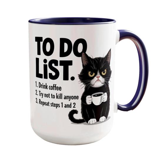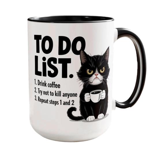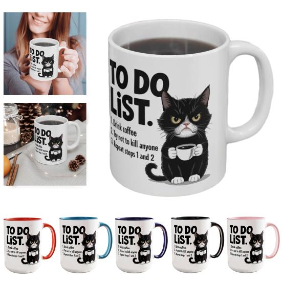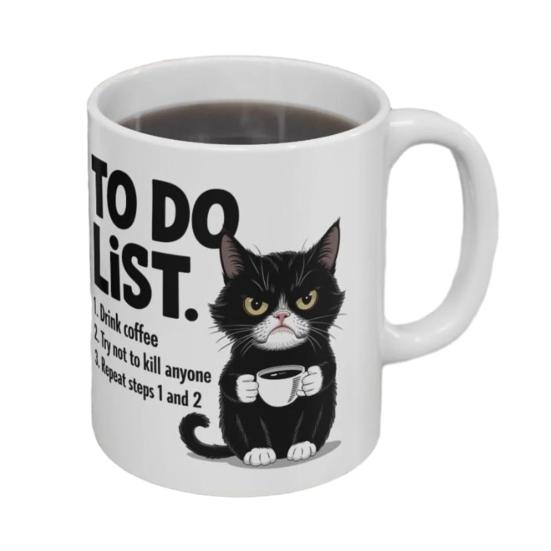 Очаровательный дизайн: Украшенная изображением очаровательного черного кота, наслаждающегося кофе, эта кружка содержит забавные списки дел, которые добавят немного веселья в вашу повседневную жизнь.