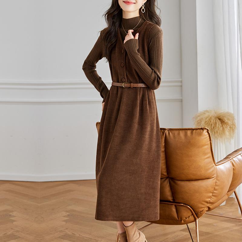 Утепленное платье женское средней длины с высокой талией, тонкая юбка, весеннее платье