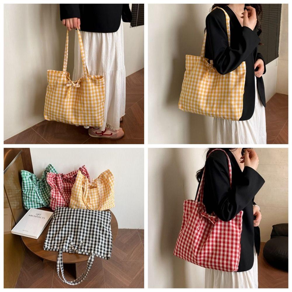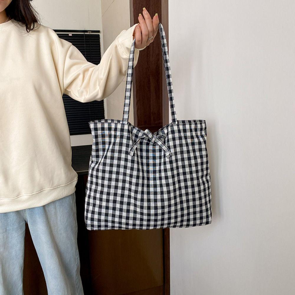 Korean Plaid Shoulder Bag Bow Tie Design Shopping Bag Portable Plaid Tote Bags Ladies