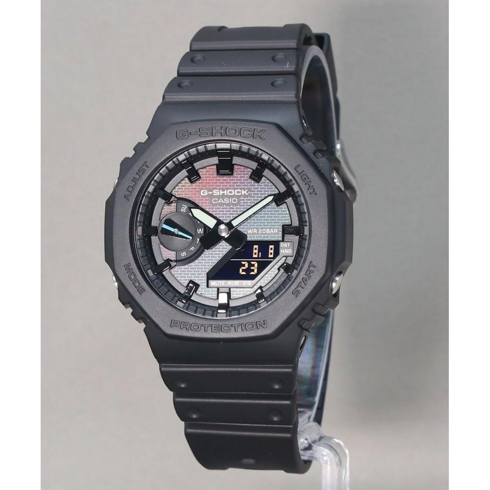 Casio G-Shock Аналогово-цифровые часы серии Rainbow Brick Wall GA-2100RW-1AJF — это мужские часы, сочетающие в себе прочность и функциональность.. Он оснащен японским кварцевым механизмом калибра 5611, обеспечивающим точный ход.. Круглый корпус изготовлен из карбона и смолы (биомасса), предлагая надежный и экологически чистый вариант. Имея диаметр 45,4 мм и толщину 11,8 мм, он одновременно заметен и удобен в носке.