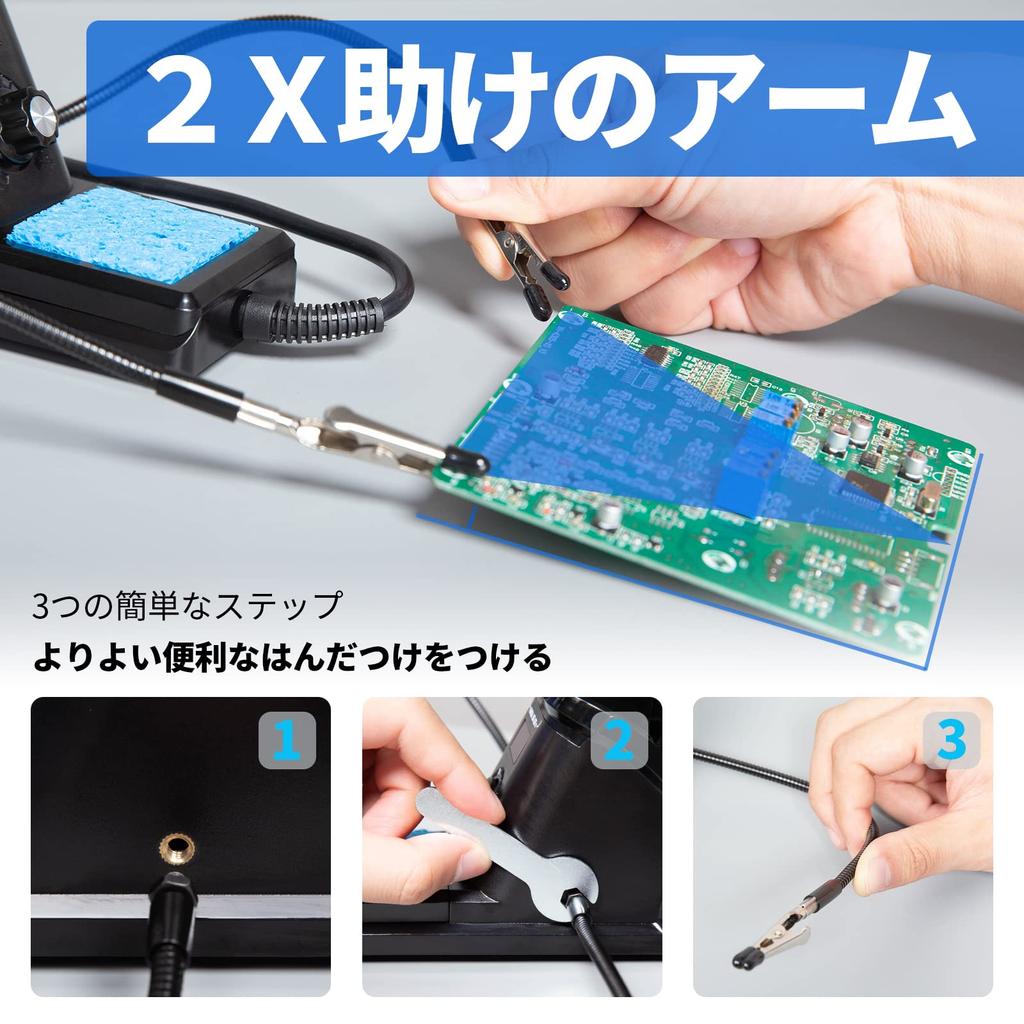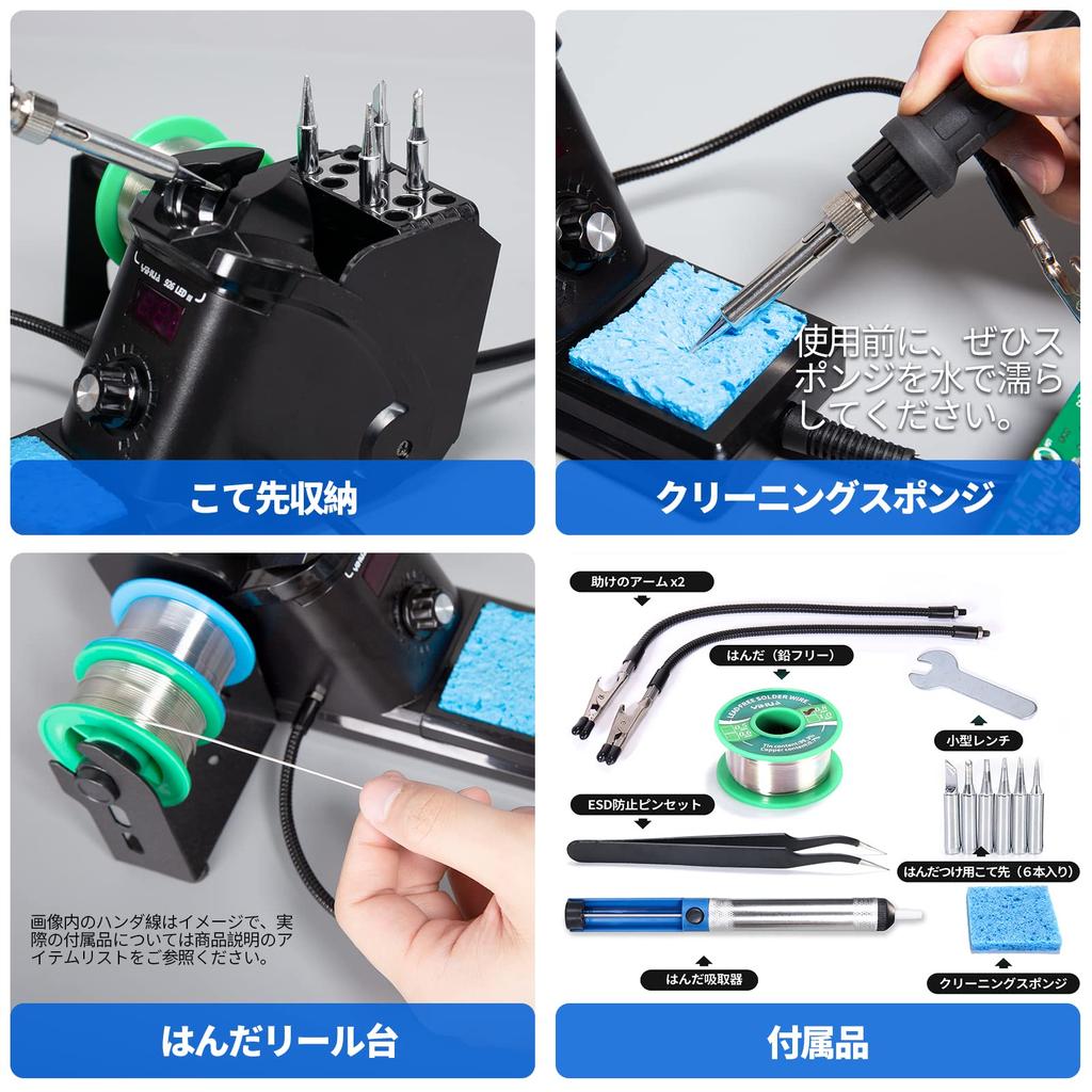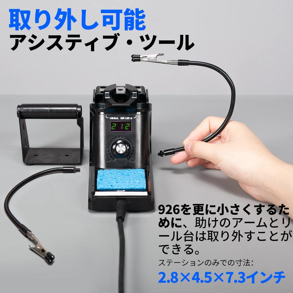«Поставляется с 14 видами аксессуаров» 2 рычага, 5 различных наконечников, 1 бессвинцовый припой (35g), 1 подставка для катушки с припоем, 1 пинцет, 1 оловоотсос, 1 чистящая губка, 1 инструкция на японском языке, 1 гаечный ключ (для снятия рук).