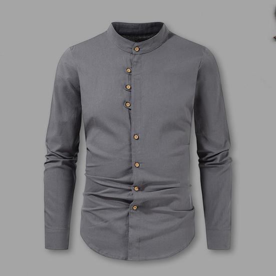 Материал и дизайн: Эта мужская рубашка изготовлена из хлопка и льна, что обеспечивает легкость, воздухопроницаемость, мягкость и приятную для кожи текстуру.. Однобортный фасон с воротником-стойкой излучает ретро-очарование, что делает его универсальной вещью для разных случаев.