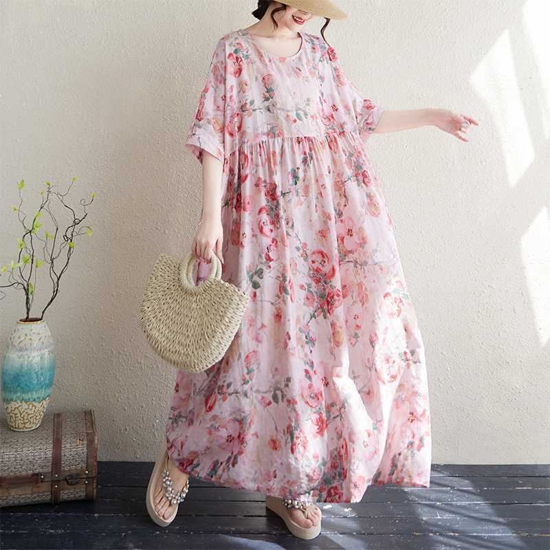 Женское тонкое хлопково-льняное платье с круглым вырезом и короткими рукавами