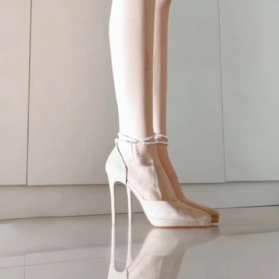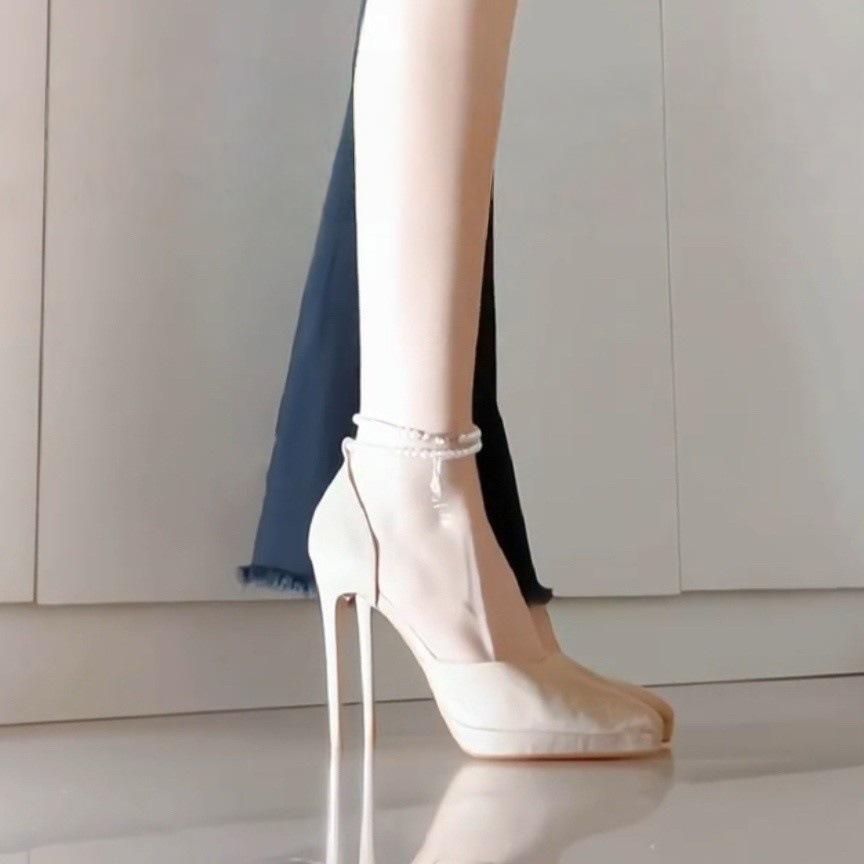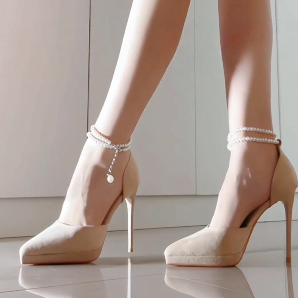 Нишевый дизайн однословная жемчужная цепочка темперамент универсальные одинарные туфли корейская версия телесная замша водонепроницаемые стол полые высокие каблуки женские