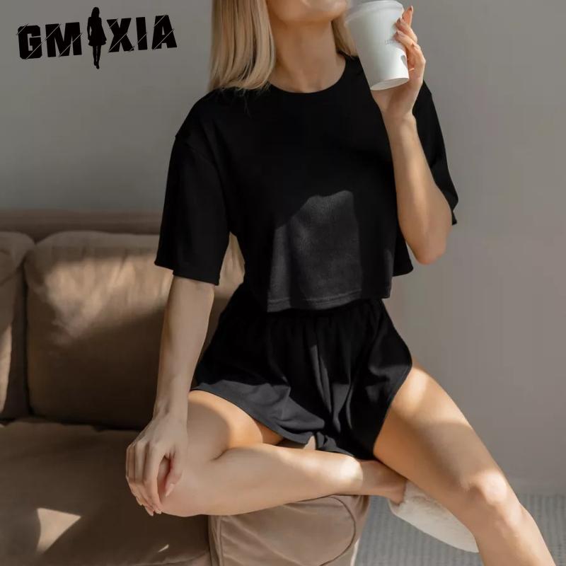 GMXIA Домашняя одежда в полоску пит, с круглым вырезом, повседневная пижама, женская носимая футболка с короткими рукавами, шорты, комплект из двух предметов