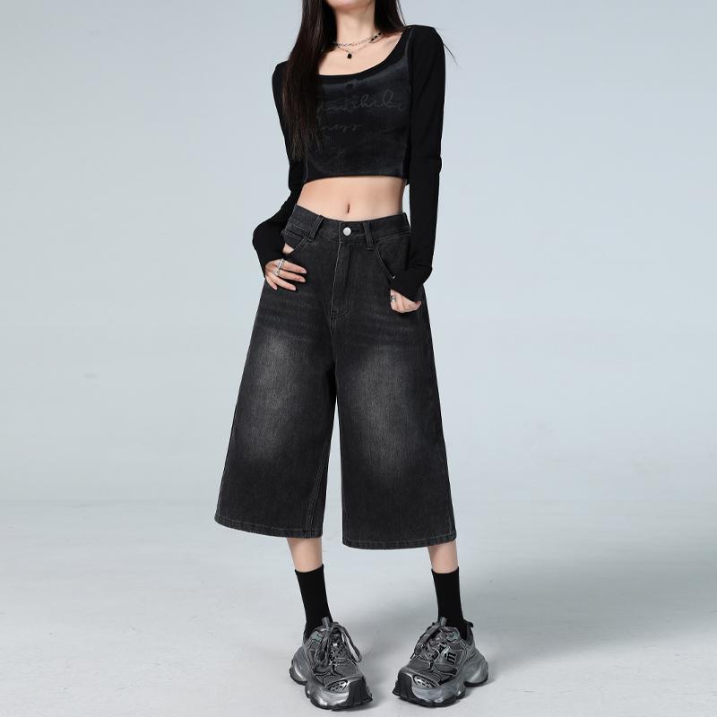 Американская высокая улица Семифутовые женские джинсы Весна Осень Свободные Широкие штанины Драпирующиеся Прямого кроя Брюки Модный дизайн