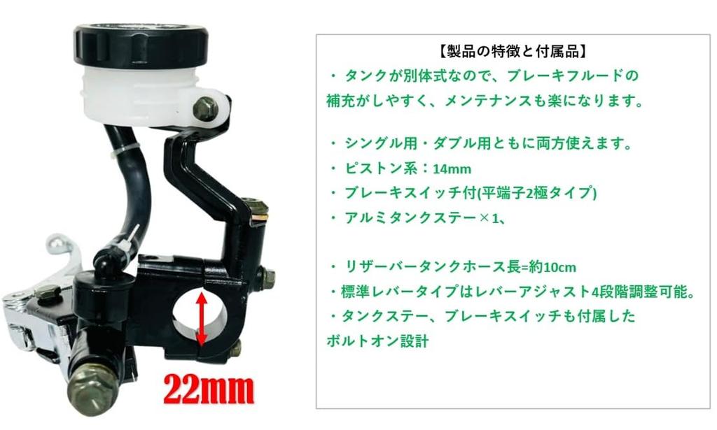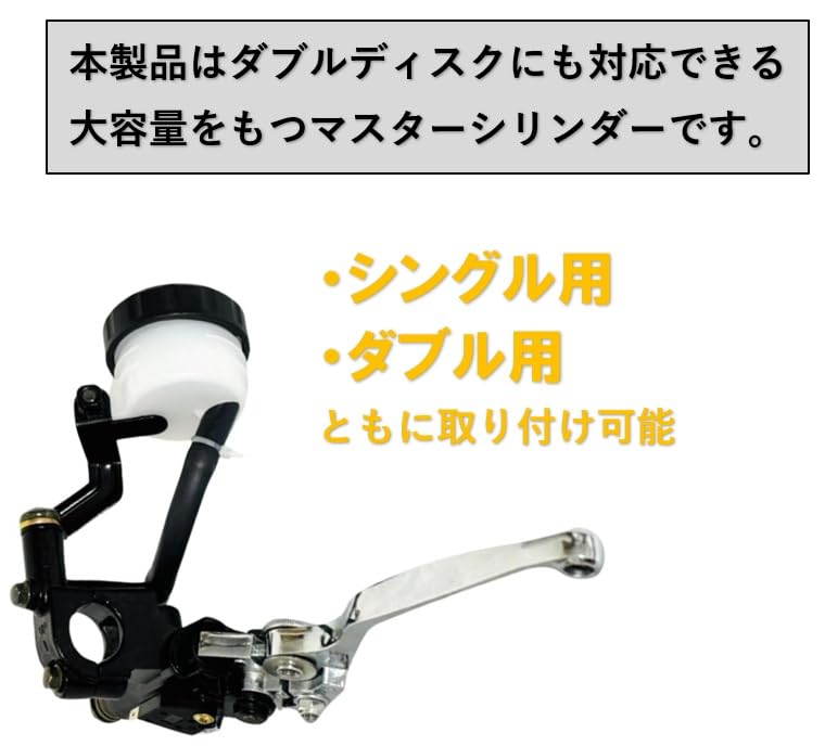 [Особенности продукта и аксессуары] ・ Бак отдельный, поэтому легко доливать тормозную жидкость, а также прост в обслуживании. ・ Можно использовать как для одинарного, так и для двойного. ・ Поршневая система: 14 мм ・ Включатель стоп-сигнала в комплекте (плоский клеммный 2-полюсный тип) ・ Алюминиевый кронштейн бачка x 1, ・ Длина шланга бачка = прибл.. 10 см ・ Стандартный рычажный тип регулируется в 4 этапа с помощью регулировки рычага. ・ Конструкция с болтовым креплением, включая кронштейн бачка и выключатель тормоза