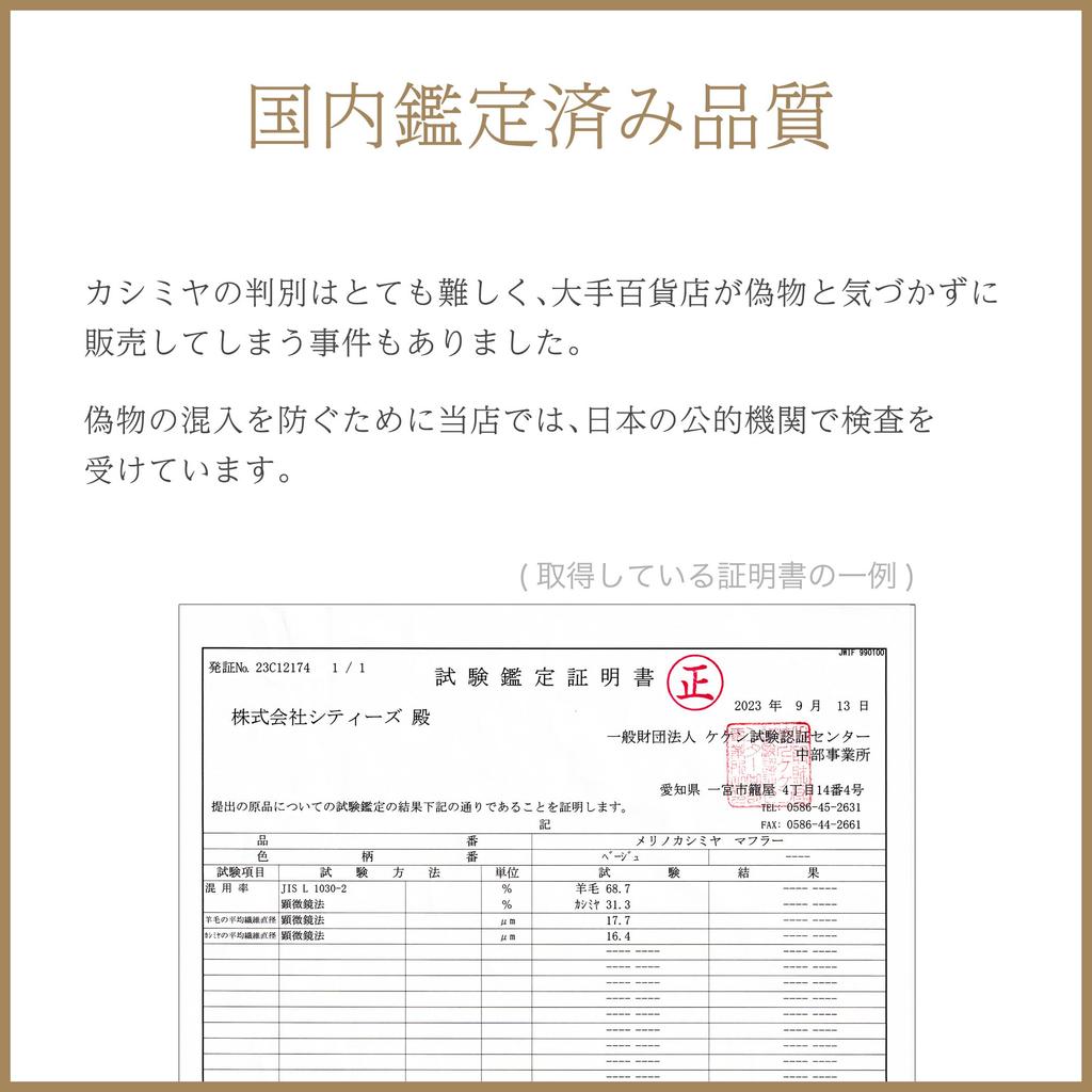 Качество проверено японским государственным учреждением. Качество кашемира было протестировано и подтверждено, и было подтверждено, что поддельный кашемир не примешивался.
