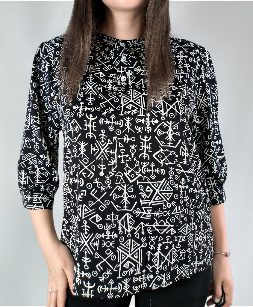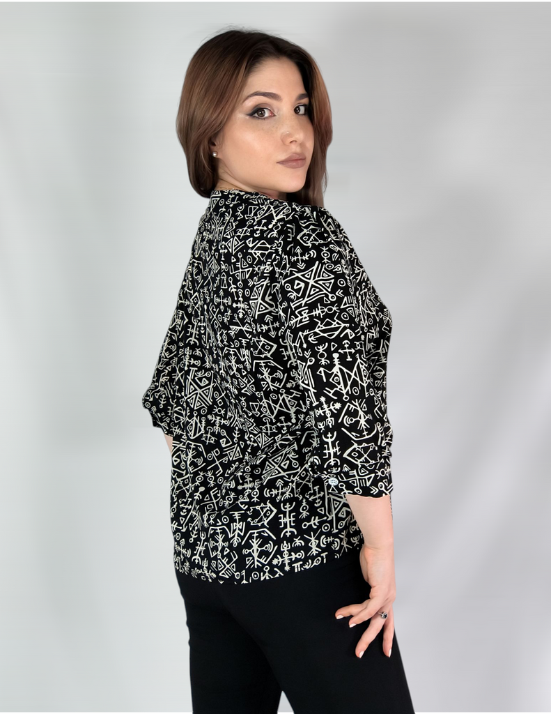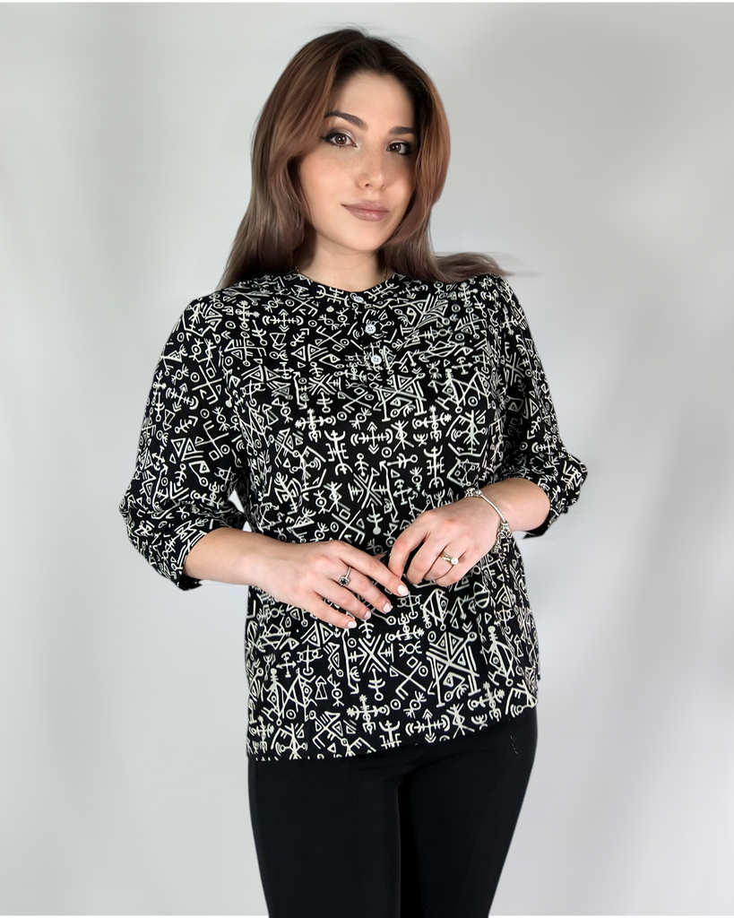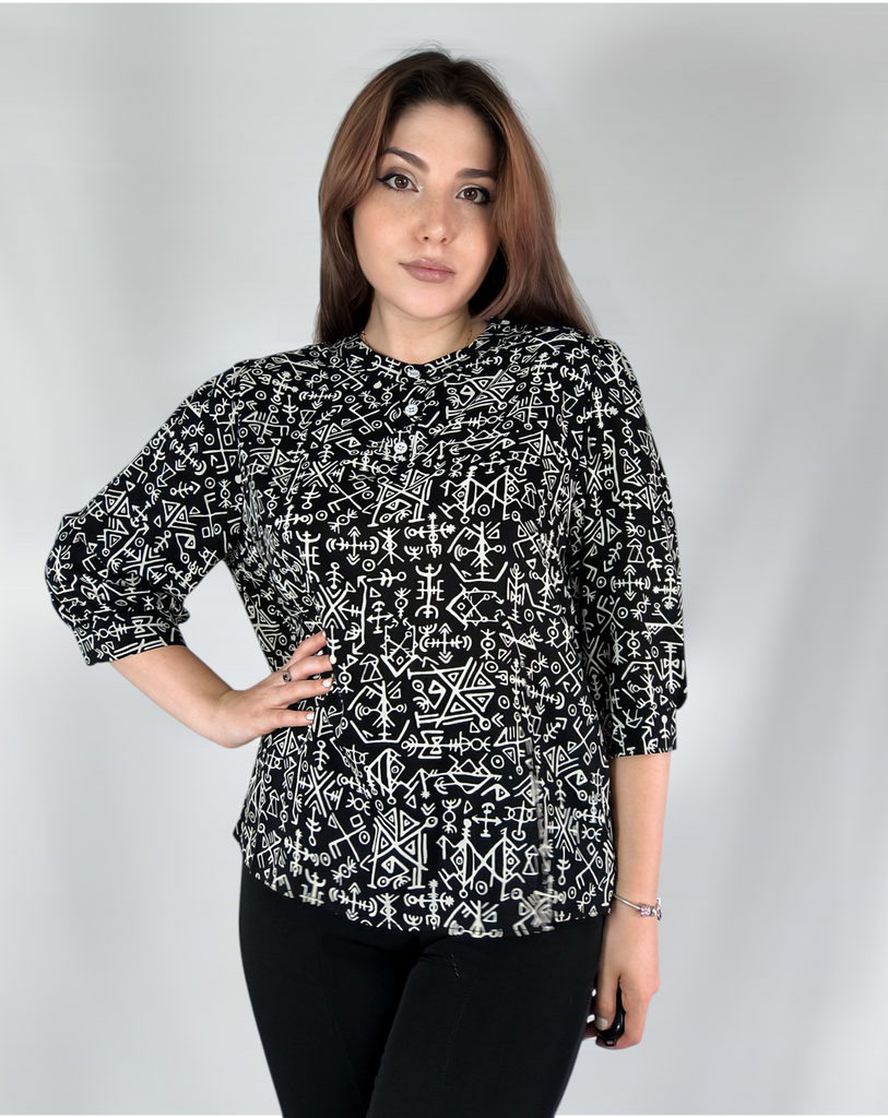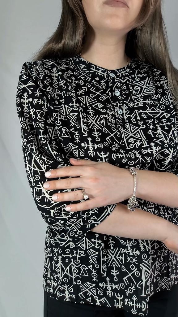 Эта блузка привлекает внимание своим необычным графическим принтом. Основной цвет — черный, на котором контрастно выделяется узор из стилизованных белых символов и геометрических фигур. Этот орнамент напоминает этнические мотивы, древние письмена или абстрактные рисунки, что придает блузке загадочный и оригинальный вид. 🔸Замеры блузки XL: Длина - 61 см ОГ - 108 см Длина рукава - 41 см Ширина плеч - 42 см 🔸Фасон блузки свободный, с воротником-стойкой и небольшой планкой на пуговицах, что добавляет ей элегантности. 🔸Рукава длиной три четверти, слегка присборенные, подчеркивают непринужденный стиль. 🔸Такая блузка будет хорошо смотреться как в повседневном, так и в более формальном образе, в зависимости от того, с чем ее сочетать. Она подойдет для создания кэжуал-образов с джинсами или брюками, а также может быть интегрирована в более строгий ансамбль с юбкой-карандаш. Благодаря своему уникальному принту, она станет ярким акцентом в любом наряде. Рекомендую 👍 Ставлю ⭐ ⭐ ⭐ ⭐ ⭐ Спасибо продавцу ❤️ и Joom ❤️