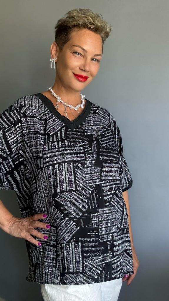 Блуза из шифона в расцветке «ноты» 📌Размеры XL-5XL Мои параметры: 167, 98-85-100 На мне размер 4 XL Блуза имеет свободный силуэт, размер можно было взять и чуть меньше, но, в принципе, и так хорошо 📌Фасон: Силуэт трапеция Перед короче спинки Плечи спущенные Горловина и низ рукавов оторочены тканью в мелкий рубчик со стрейч 📌Ткань: Китайский шифон Не тянется Немного электризуется Не просвечивает 📌Пошив фабричный, есть бирки и этикетки 📐Замеры: Плечи нет Длина рукава от горловины 40 Ширина рукава 18-25 ОГ подмышками 128 ОТ 128 ОБ 138 Длина 64-76