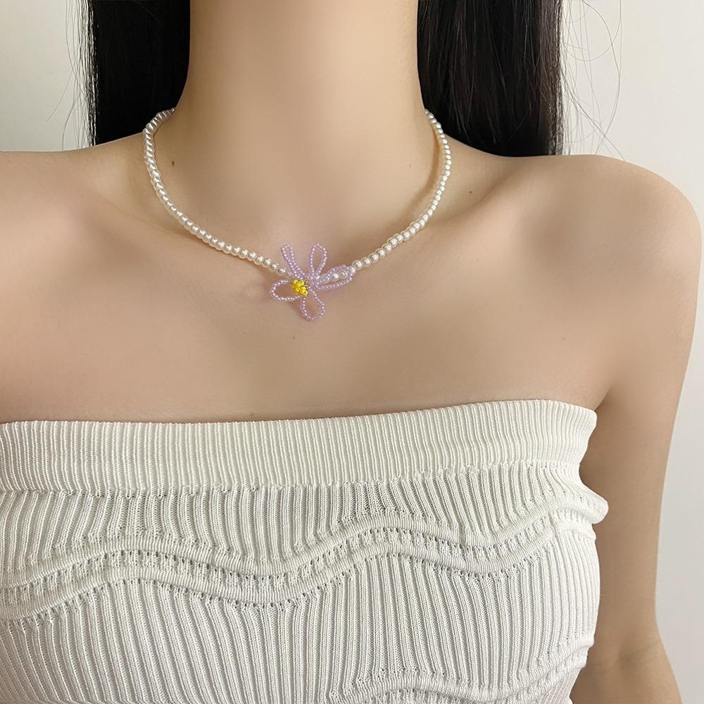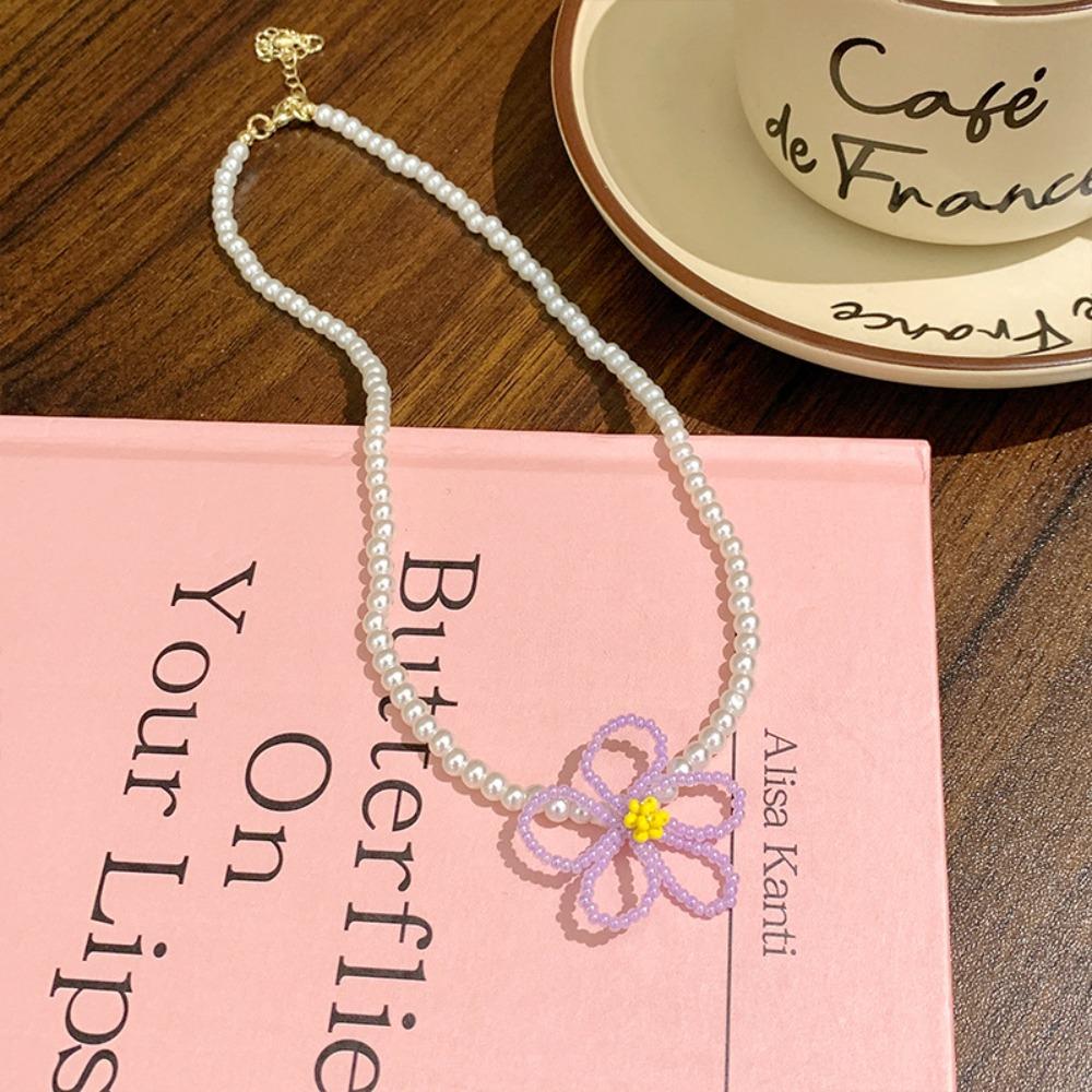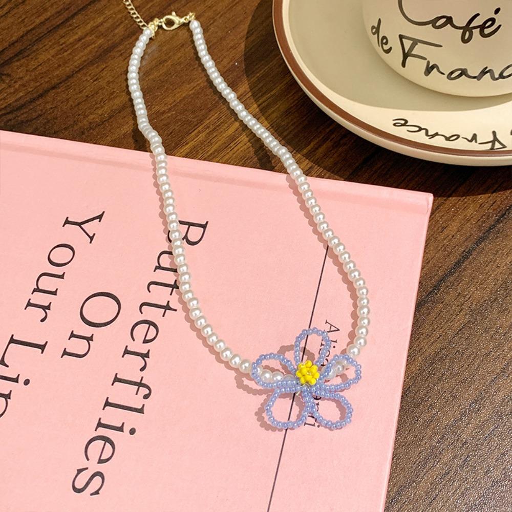 Colorful Flower Necklace Handmade Beads Choker Sweet Imitation Pearl Necklace Seaside