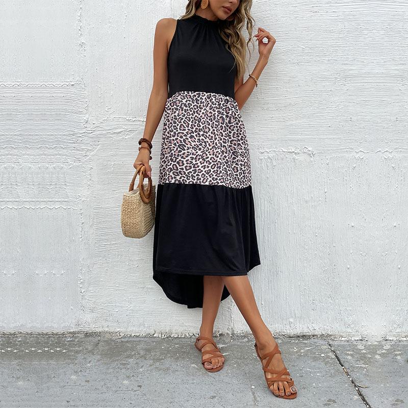 Летнее новое платье с вырезом под горло, облегающее, без рукавов, с леопардовым принтом и вставками