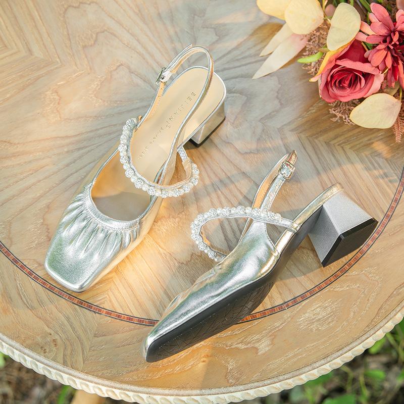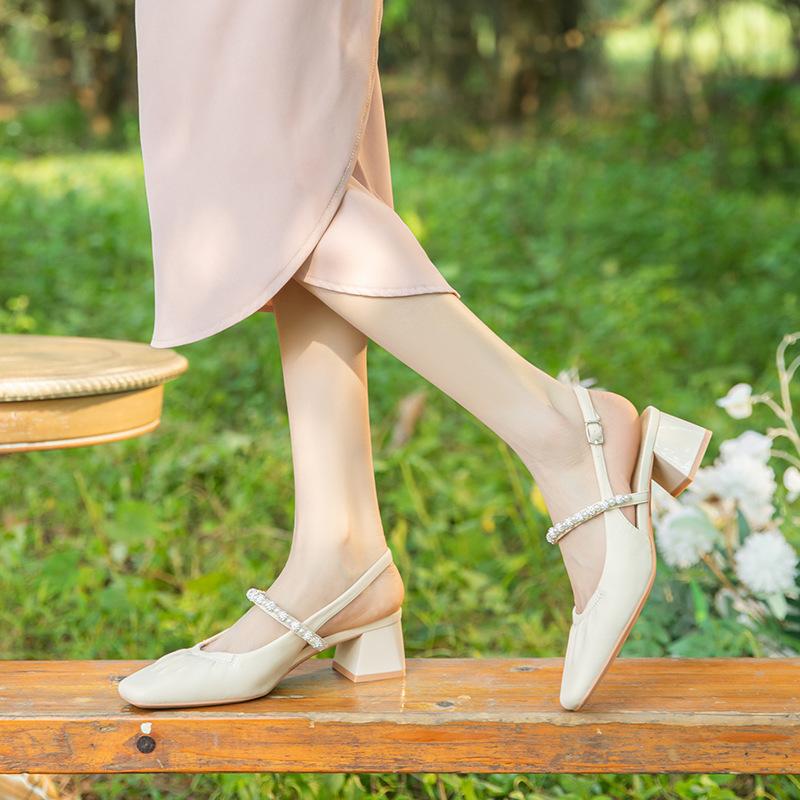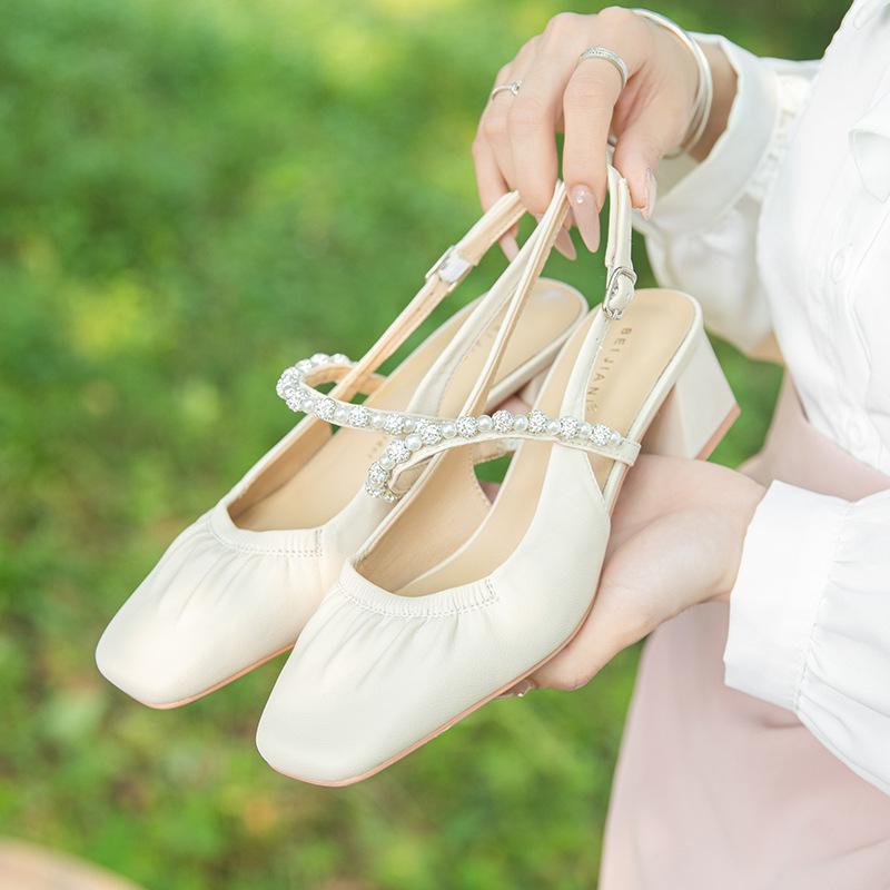 Pearl rhinestone sandals women's outerwear one-word with thick heel square head sheepskin middle heel back strap Mary Jane