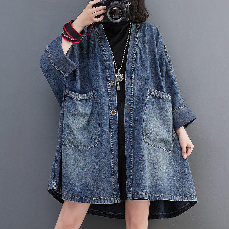 Женская джинсовая куртка-ветровка средней длины с V-образным вырезом и карманами - осенняя свободного кроя однотонная — купить товар онлайн с бесплатной доставкой по всему миру!