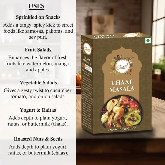 МАГИЯ МНОГОКРАТНОГО ИСПОЛЬЗОВАНИЯ - Превратите скучные фрукты, овощи и сэндвичи в восхитительные лакомства с нашей органической пудрой чат масала. Просто щепотка раскрывает чатпата вкусы, которые понравятся вашей семье.. Используете ли вы его как порошок масала для фруктового чата, порошок масала для пани пури чата или как яркую приправу для салата, это ваш универсальный герой вкуса для каждой перекусочной атаки.