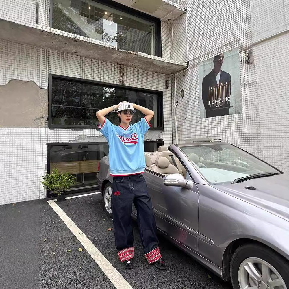 RogueWave Американский Ретро Клетчатый Пэчворк Закатанный Край Женские Джинсы Хай Стрит Харадзюку Свободные Широкие Прямые Штанины Мужские и Женские Брюки
