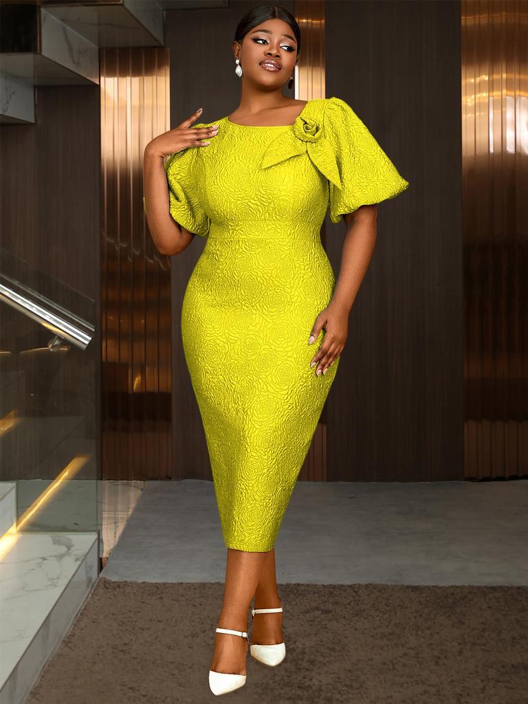AOMEI Элегантные женские платья для вечерней вечеринки, миди, с круглым вырезом, короткими рукавами-буфами, в стиле ампир, с 3D-цветами, облегающие, жаккардовые наряды
