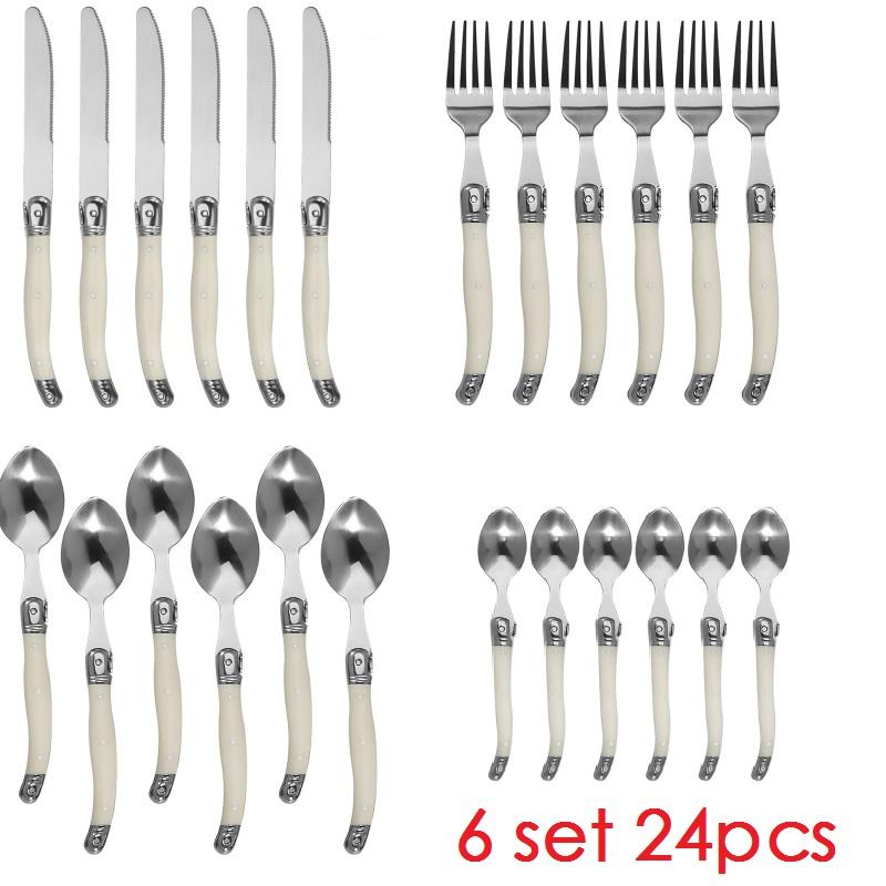 Набор столовых приборов Laguiole из 24 предметов Нож для стейка Вилка Суповая ложка Чайная ложка Ручка из пластика цвета слоновой кости Нержавеющая сталь пищевого класса Столовая посуда