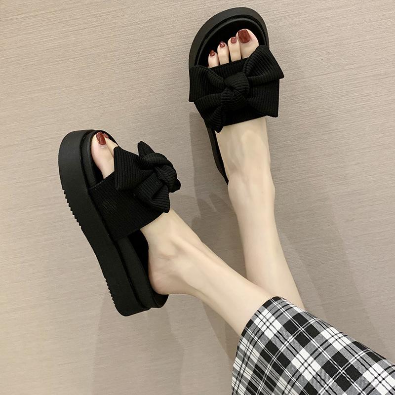 Тапочки женские летние модные новые с бантом на толстой подошве маффин шлепанцы на одной перемычке универсальные пляжные сандалии