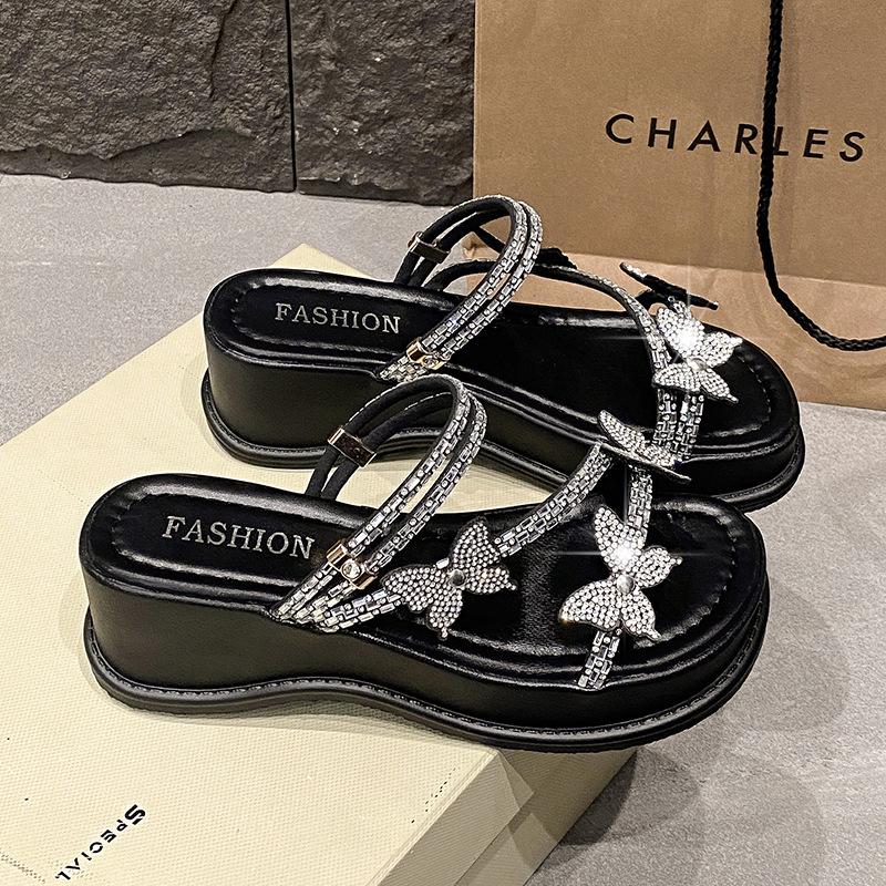 Премиальные тапочки женская уличная обувь 2025 весна новая мода два способа носки толстая подошва увеличивающая рост стразы крутые тапочки