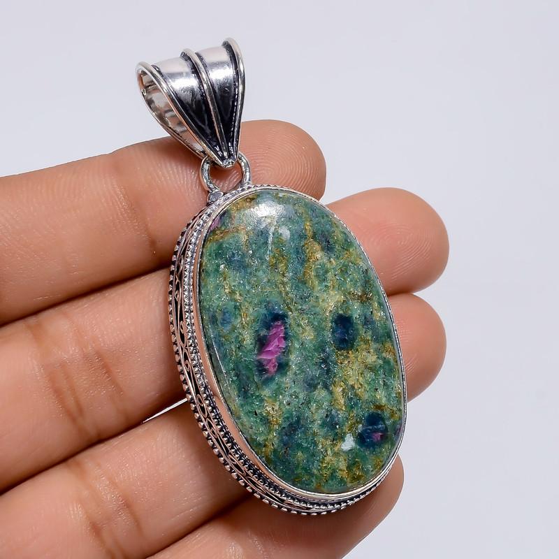 Fabulous Top Grade Qualite 100% Natural Ruby Fuchsite Oval Shape Vintage Style Handmade Jewelry 925 Steling Silver Pendant 2.1" WSJ-4823